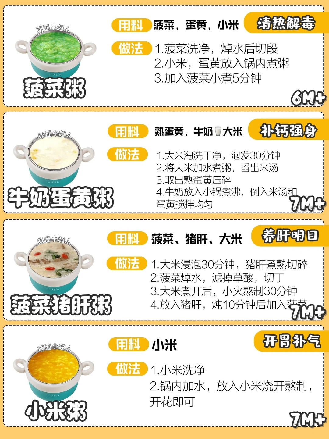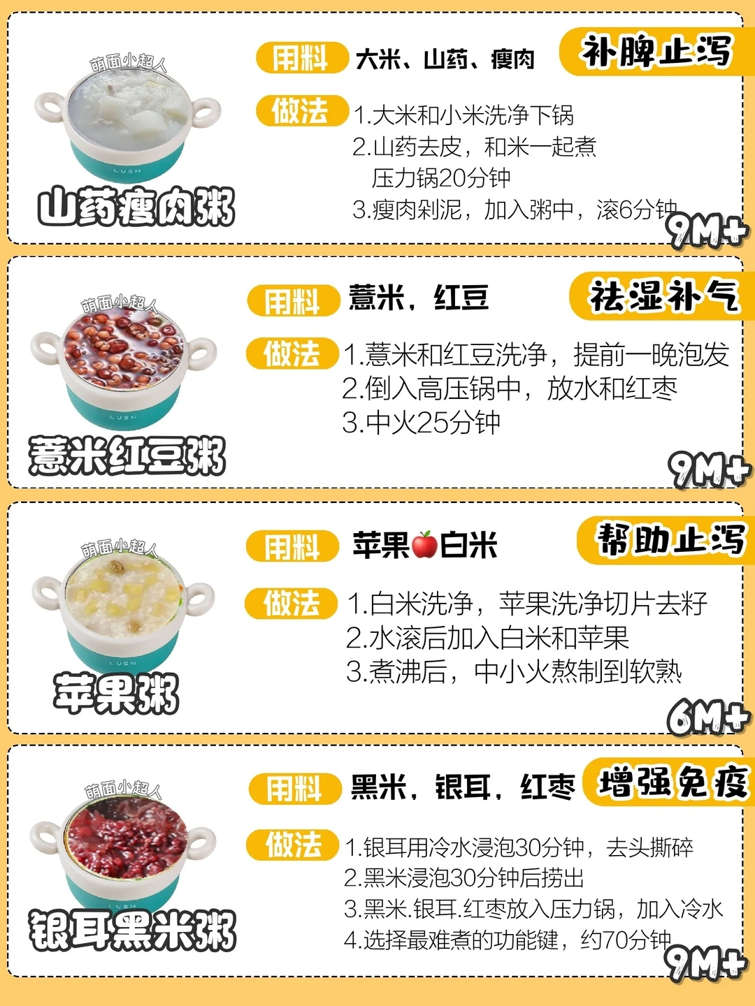 今天整理了24款辅食粥,适合6-12个月的宝宝,具体对应月龄和营养请参考图片,一起为宝宝学起来吧!