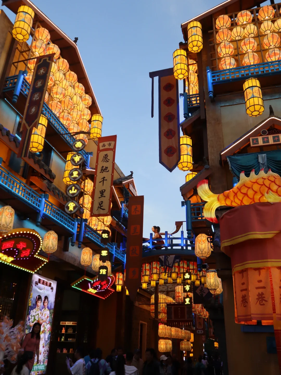 ✅唐风仿古建筑的街巷,随处可见的花灯,东西两市汇集了各色小吃,边吃边逛,可以玩一整天