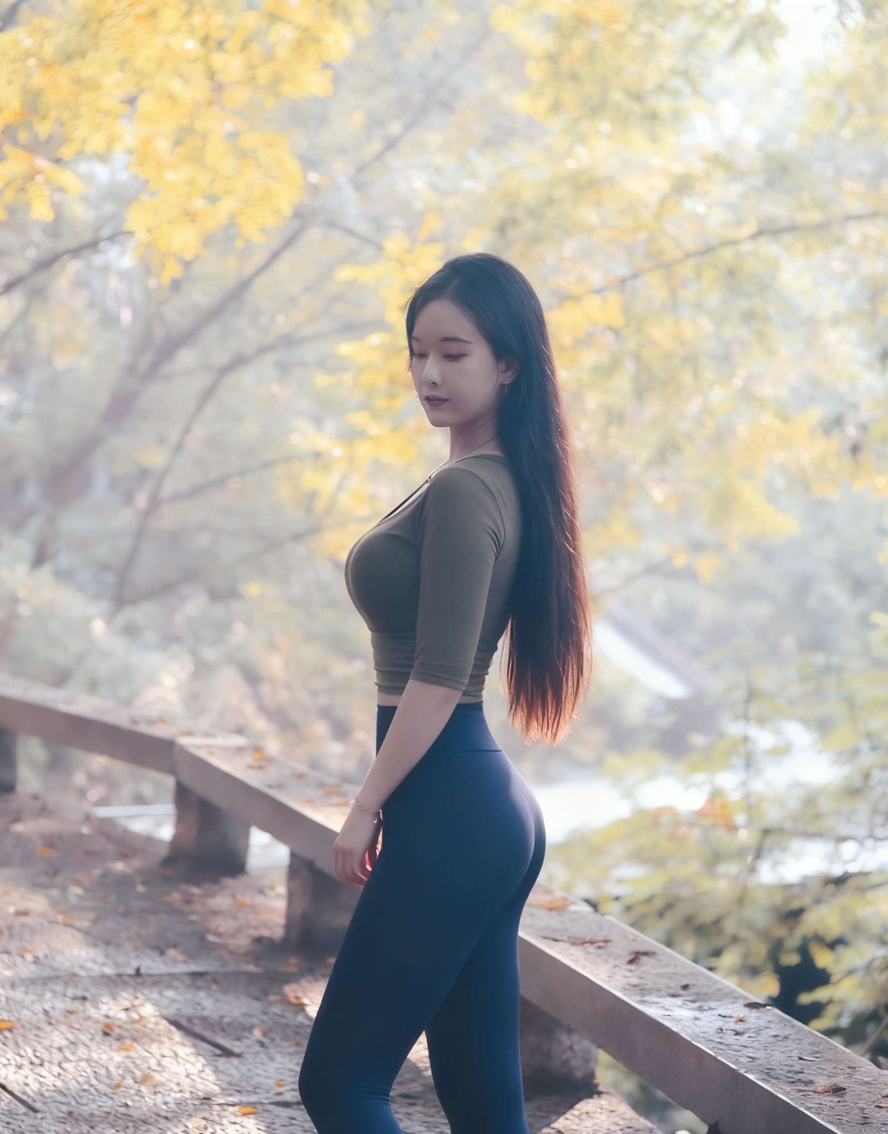 深橄榄绿短款上衣搭配藏青色紧身裤,运动风也能穿出时尚感。短款设计优化身...