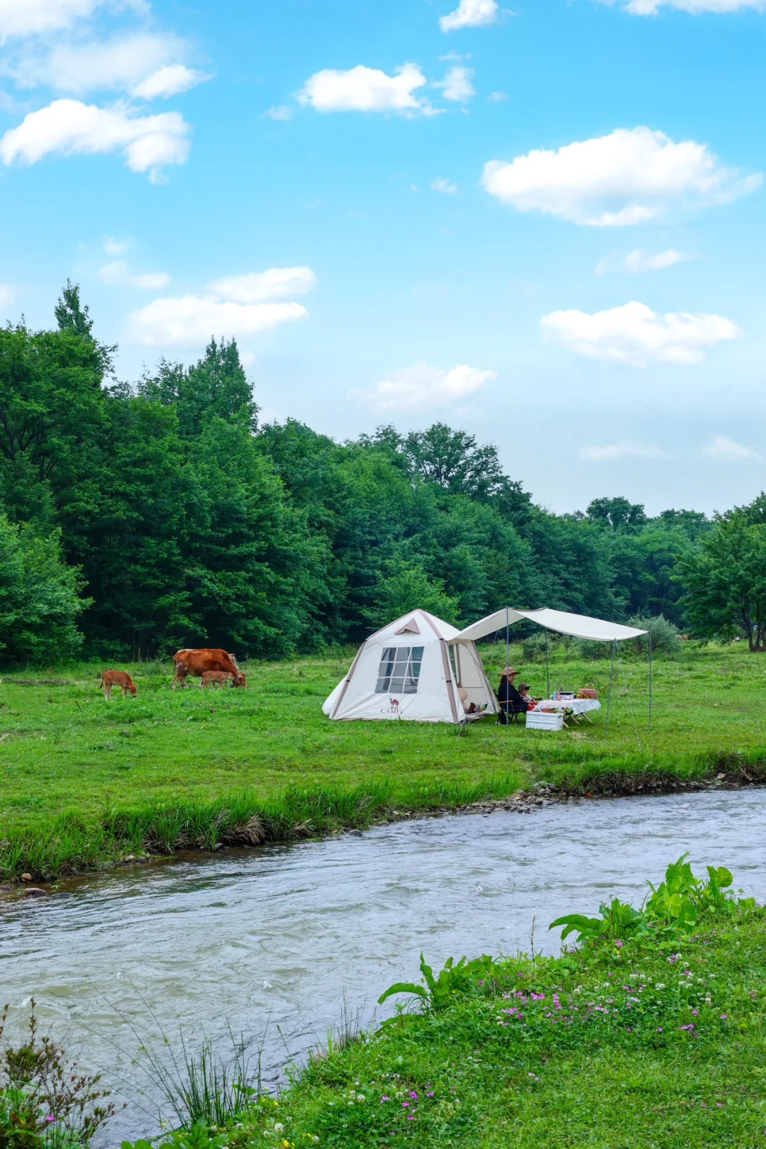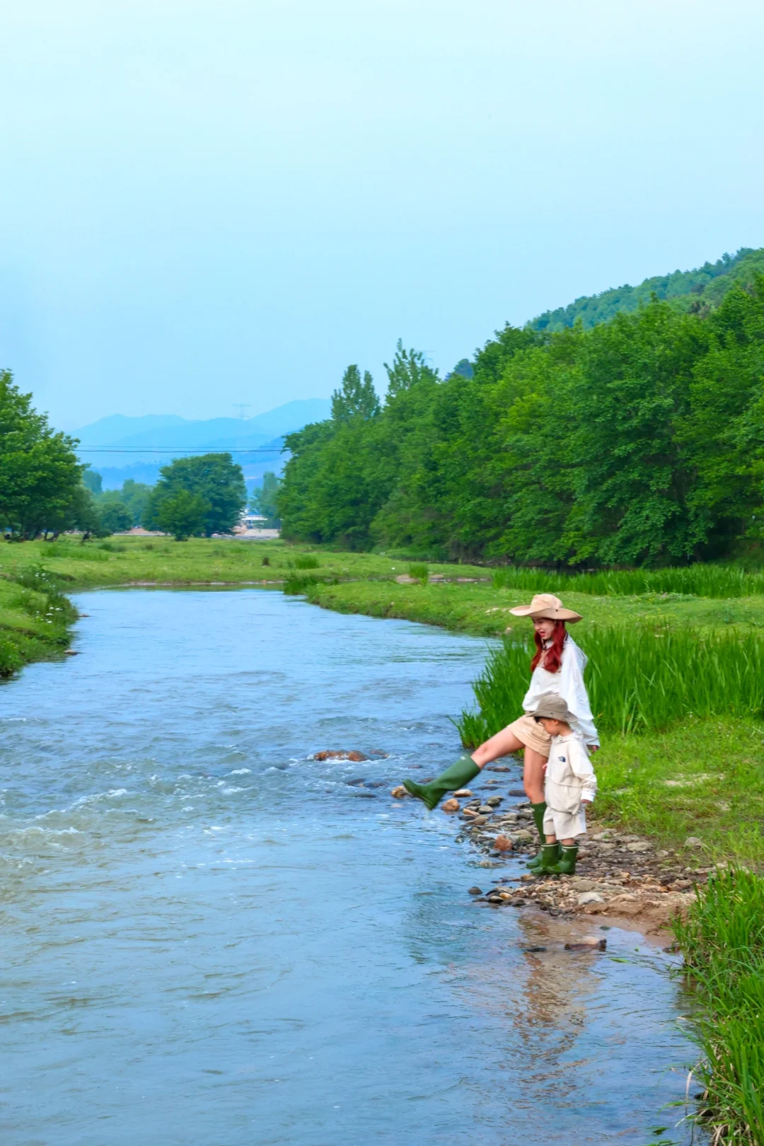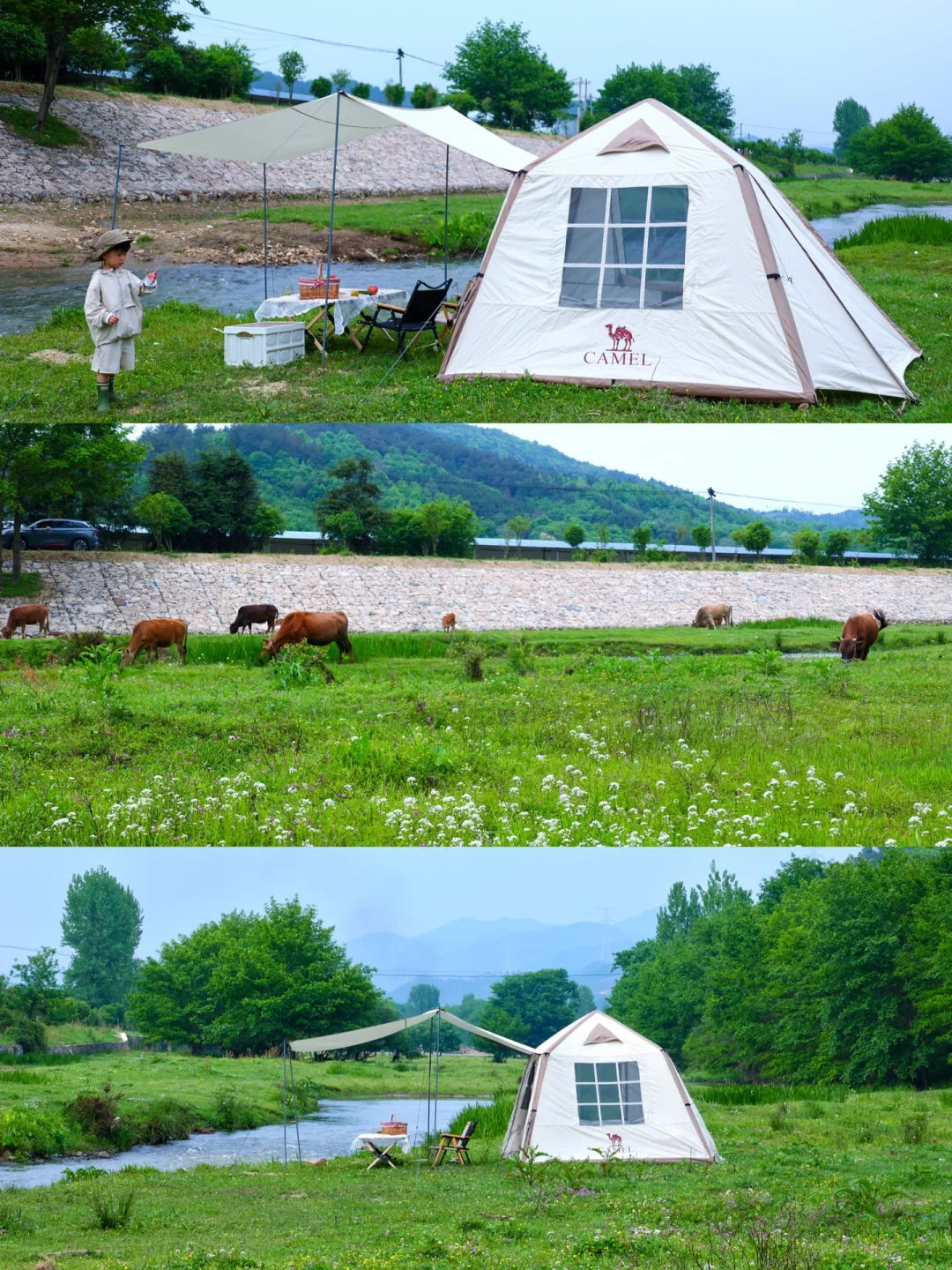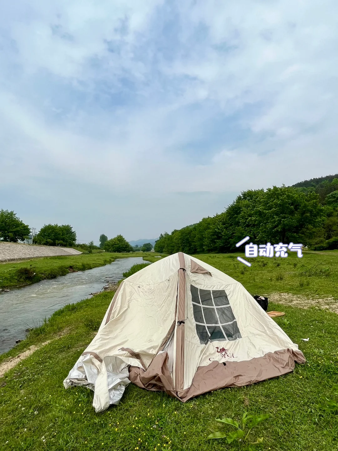 二刷的杨山河吧‼️依山傍水的天然氧吧 开车🚗直达免费露营地‼️这个季节去很凉爽🧊 可在水边搭帐篷,划船🚣‍♀️、穿套鞋玩水 捞鱼、玩水枪、烧烤等‼️ 风景一绝,有种小新疆的感觉 露营的快乐这里都有✔️ - 📍定位:杨山河吧(开车🚗2h)停车免费 - 周末一家人来享受大自然 对于带娃家庭来说出门带个帐篷真的很有必要 这不这次带上了新升级的客卧一体的充气帐篷【骆驼流云小筑】 ✔一键自动充气,按一下帐篷就可以自动长起来。特别是夏天,我们在旁边准备水果的功夫,帐篷就搭好了,那叫一个凉爽舒适。 ✔1.8米加高的帐内空间,属于比较舒适的高度,一家三口在里面休息玩耍都很宽敞,站起来活动行走也很自如。 ✔双开门+两扇大网纱观景窗🪟,坐在帐篷里或者天幕下都很通透,可以惬意的欣赏窗外美景 ✔后天幕还可以进行闭合,到了晚上把鞋子、行李放在后空间,不怕露水,也不怕下雨淋湿了 杨山河吧‼依山傍水的天然氧吧已经二刷了 开车直达免费露营地‼这个季节去很凉爽🧊 -