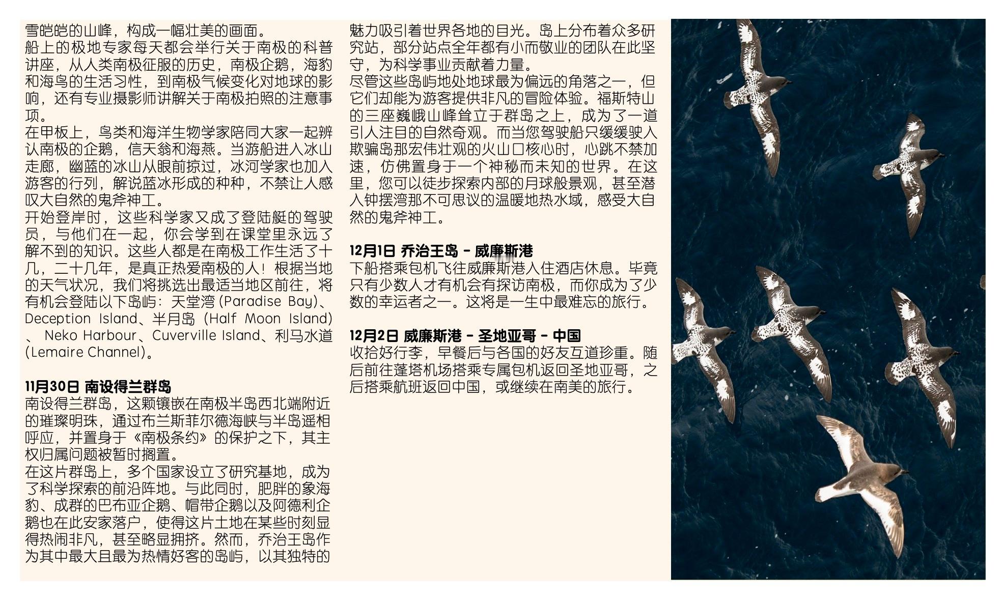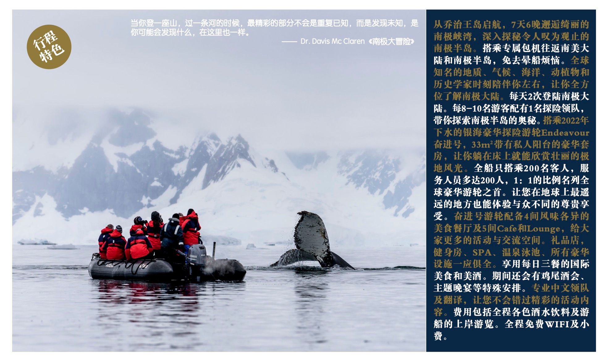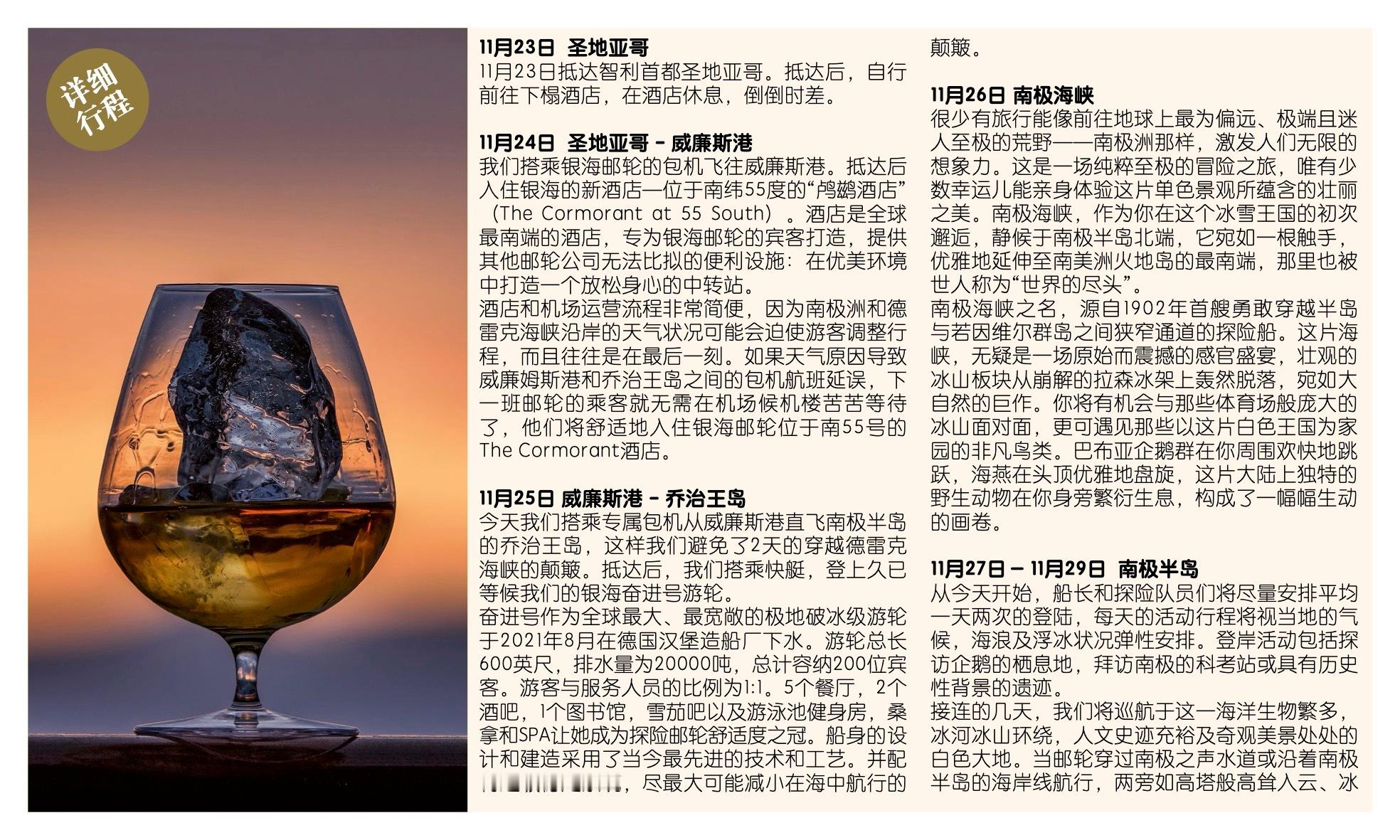 『2026 南极最好的线路设计和价格』经过 23-25 年度的多个航次,银海豪华极地邮轮奋进号调整了线路设计,达到了我心目中最完美的形态:传统南极航线有两个问题,第一是海上日太多,穿过德雷克海峡一来一去就是四天,这四天啥也干不了不说,风高浪急最容易晕船。后来就有了飞机飞过去的选项,但飞机受到天气影响特别大,一不留神飞不了,就要延误上船时间,也特别令人崩溃。银海大手笔地在威廉姆斯港建设了一个酒店,这是全球最南端的酒店,南纬 55 度的鸬鹚酒店,专为银海邮轮客人打造,这大幅降低了飞越德雷克海峡的时间(比彭塔阿雷亚斯起飞节省了 45 分钟),使得飞机可以灵活安排起飞时间,在很短的气候平静期飞越海峡接送客人,保证旅程能够按时展开。这还不算,银海邮轮还提供了智利首都圣地亚哥一晚五星酒店住宿,从圣地亚哥飞威廉姆斯港,以及再飞南极乔治王岛都是包机,还包括威廉姆斯港两晚住宿,四程包机和三晚住宿全部包含在票价之内。这完美解决了晕船不敢去南极的顾虑,将所有在船上的时间都用来欣赏南极景色。至于银海探索号,我已经乘坐它进过南北两极,这艘船有多好我都懒得再讲了,可以翻我以前的视频看看。11.25 号,2026 年,只此一个航次有特价。私信五哥询价,确定预定的朋友五哥再给你 10% 折扣。