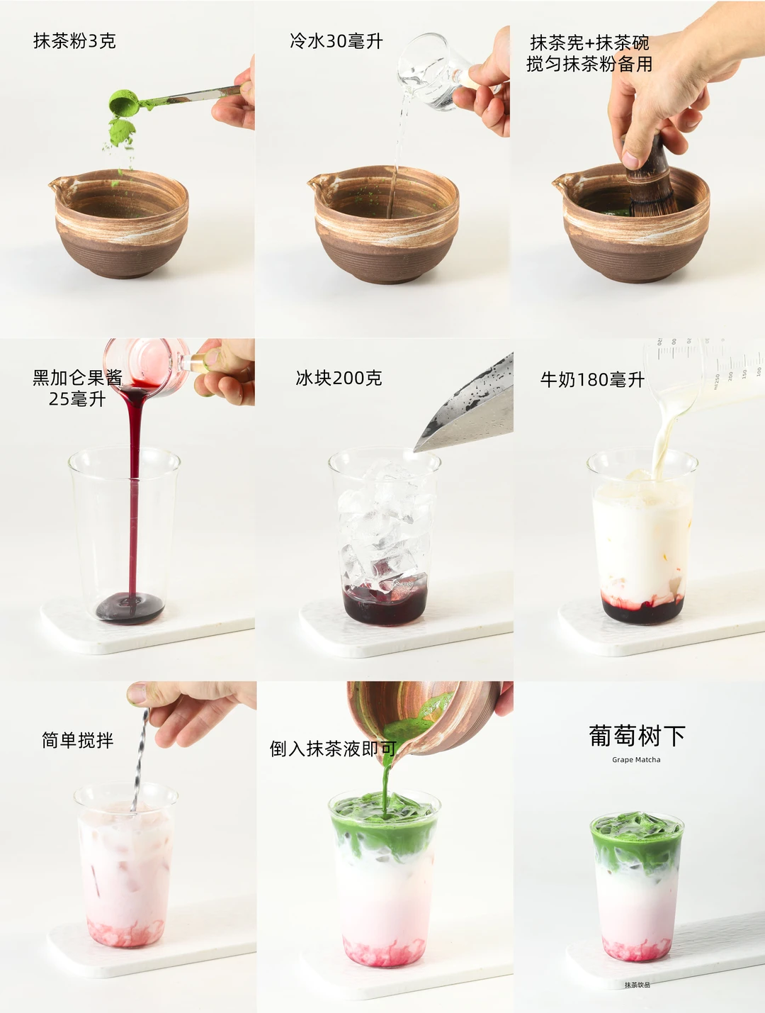 图片有教程 [一R]3克抹茶粉,用30克直饮水化开【一定要用抹茶宪】 [二R]杯底加入黑加仑浓浆25克,冰块200克,牛奶180毫升,进行简单搅拌。 [三R]倒入步骤[一R]的抹茶液即可。 有用到好用的抹茶粉的宝子们可以在下面说一下哦。
