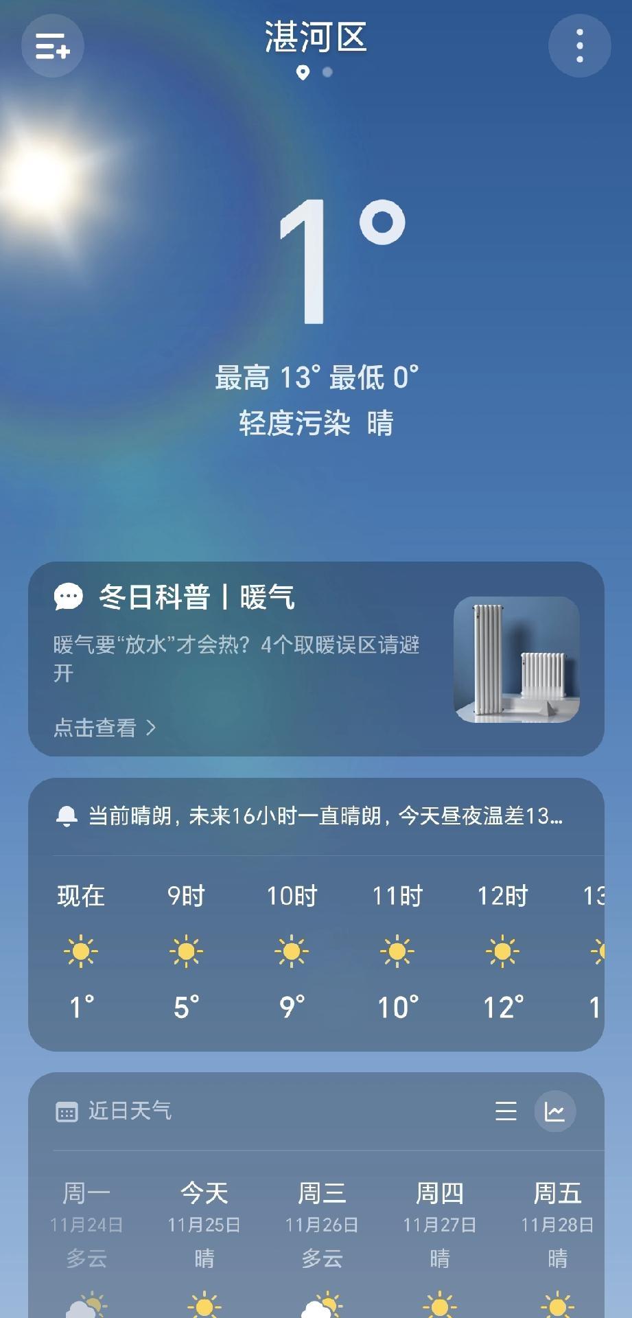 11月25日上午8点40分,暖气进水管温度近50度,最低温度的卧室此时温度达25