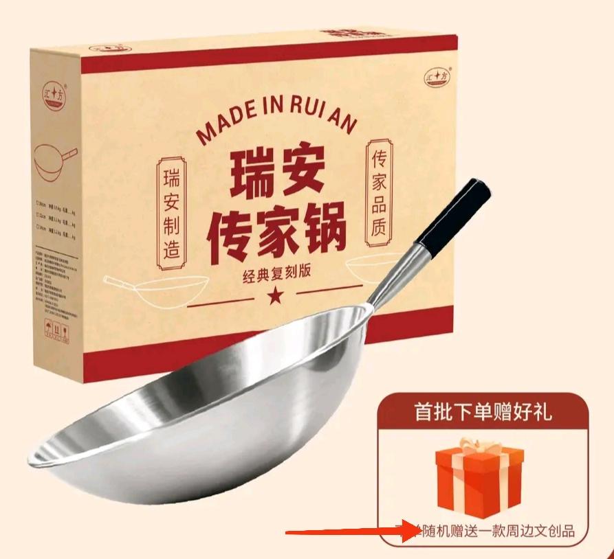 瑞安不锈钢传家锅今天开始预售了,热热闹闹两个多月了吧,那些苦等的粉丝终于有了盼头。 看到了预定的人数,真为这个小厂的老板感到有点担忧,不知道他们的产能能否跟得上。 没想到还可能随机得到一份当地的文旅创意赠品,这个想法挺好。 款型推出大小两种,价格高于以前网传的60多元。 其实价格高低倒无所谓,主要是大家能买到一口好锅,应该是值得的。