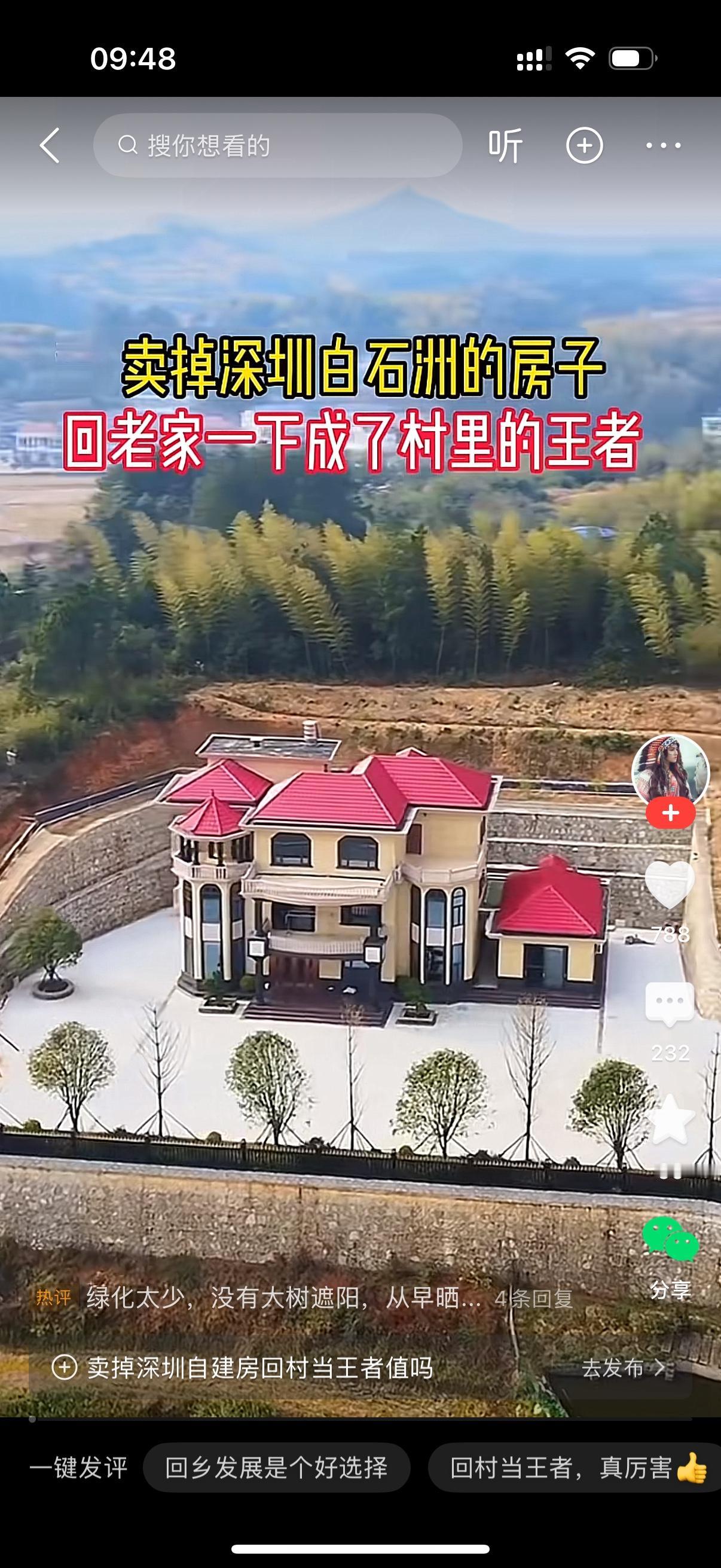 朋友在最高峰,也就是2022年,把深圳白石洲的房子卖了回老家。他历时三年修建的大别墅终于完工了。朋友邀请我回家参加别墅落成。我回去了,真是太震撼,可以说是金碧辉煌。我问朋友这别墅花了多少钱?他说不多,也就200万出头。我羡慕他,深圳的房子卖了1000万,卖在历史最高点。现在的他回到老家就是富甲一方,成了村里面最有钱的人,他就是村里的王者。