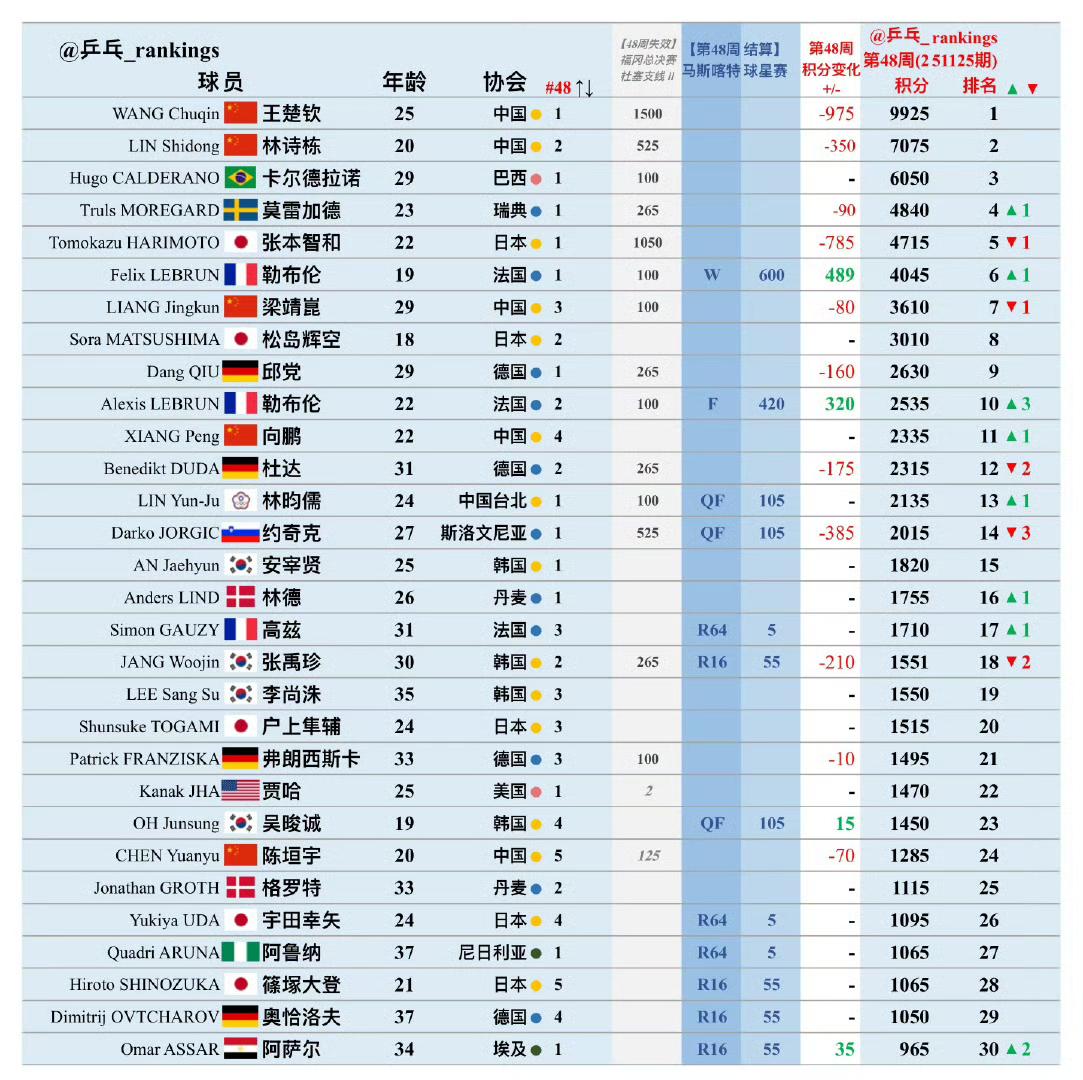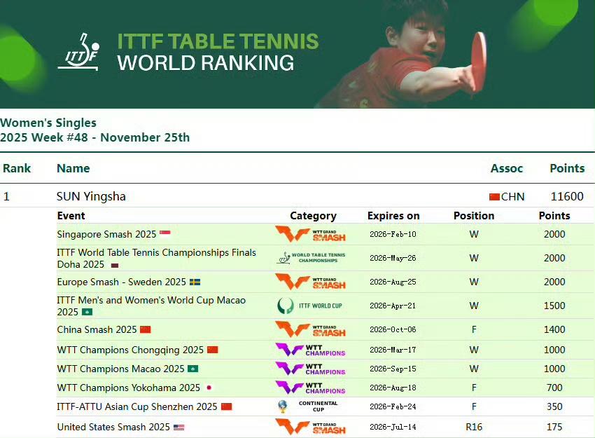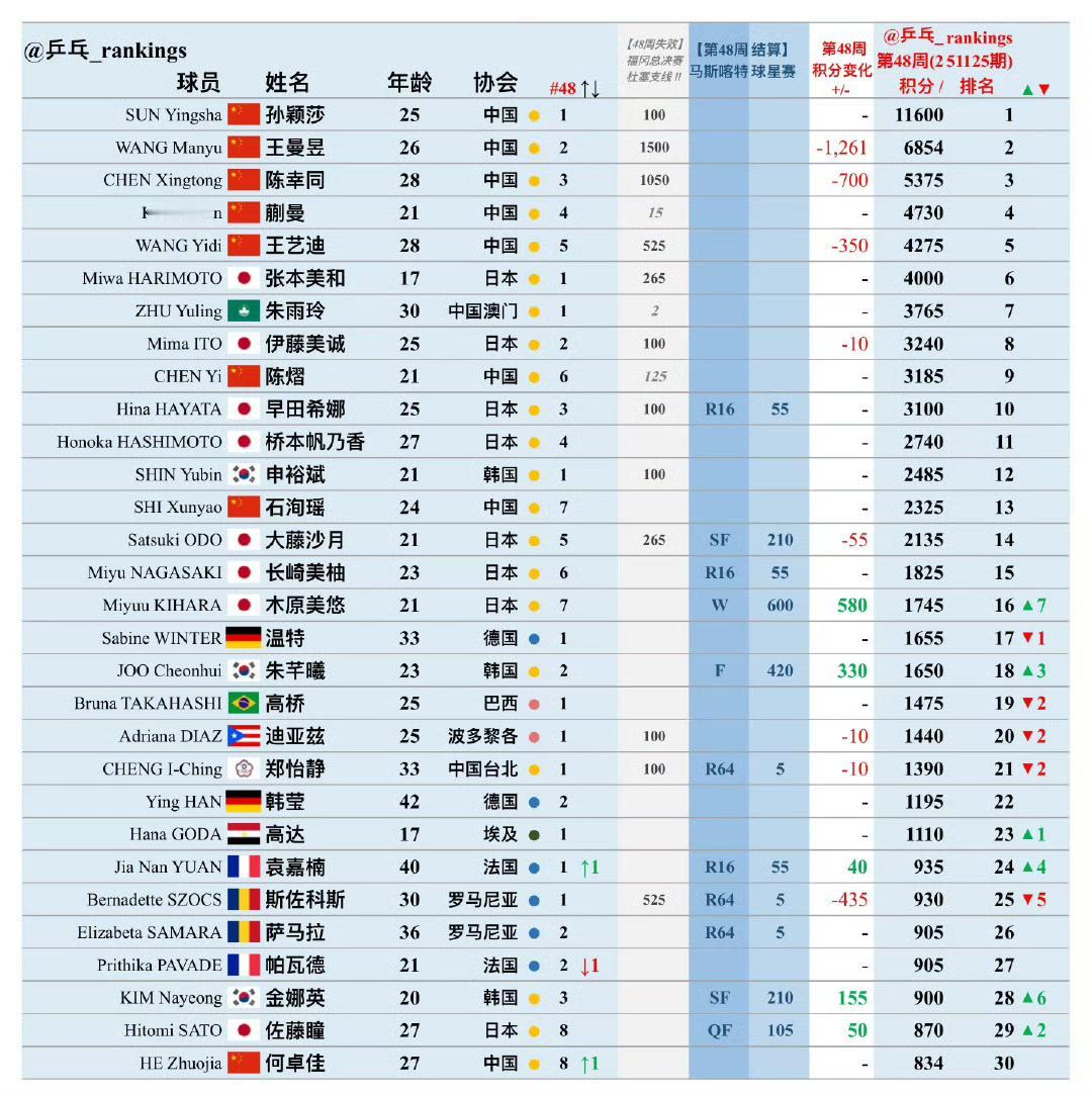 孙颖莎王楚钦领跑世界排名,孙颖莎连续第176周世排第一 2025年11月25日,国际乒联第48周排名, 孙颖莎以11600分稳居女单世界第一, 王楚钦以9925分稳居男单世界第一。 孙颖莎实现连续176周,约3年4个月霸榜,刷新了乒坛史上最长连续第一纪录。 并且断层优势领先。 牛马一样的赛程,当然也要有实力才可以稳居前三位, 前三的都是厉害的。 作为球迷,私心,希望他们可以休息调整, 百花齐放,那就交叉式领跑, 压力和责任每个人都要扛一扛!