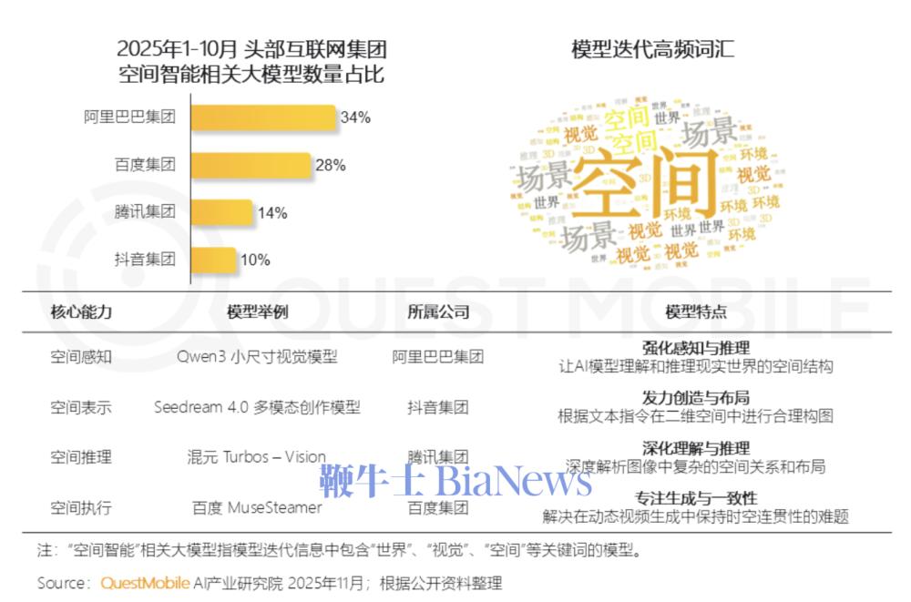 报告提到,1-10月,阿里巴巴集团、百度集团、腾讯集团、抖音集团空间智能相关大模型数量占比分别达到34%、28%、14%、10%。