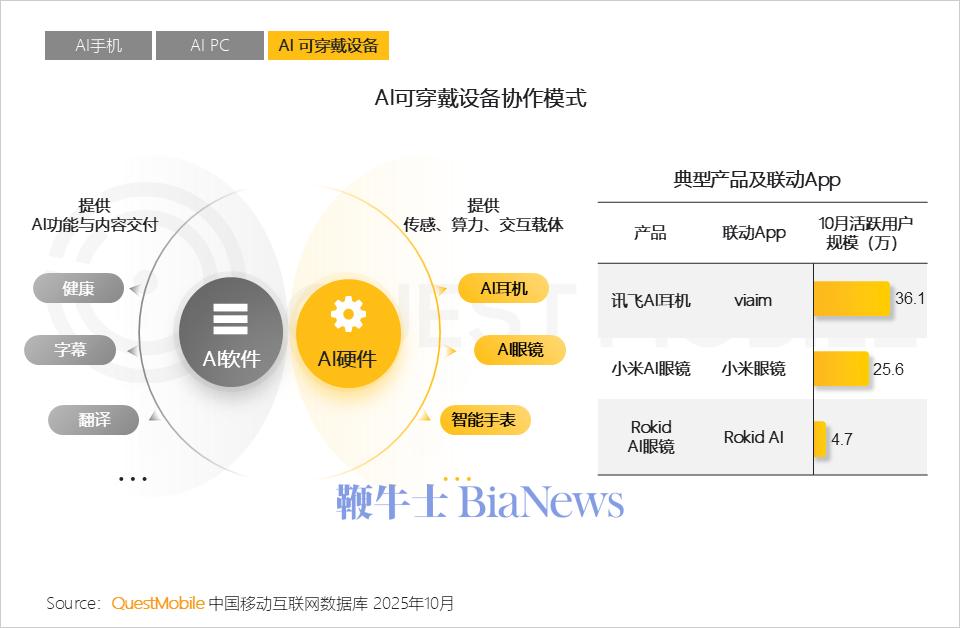 截止到2025年10月,智能穿戴类App月活跃用户规模达1.59亿,同比增长12.8%。其中,小米眼镜APP10月份月活用户达到25.6万,讯飞AI耳机联动APP“viaim”10月份活跃用户规模达到36.1万。