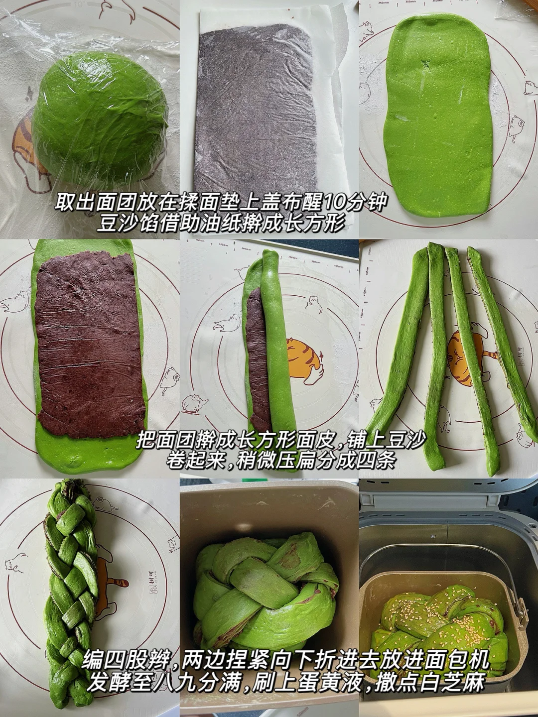 4️⃣把面团擀成长方形面皮,铺上豆沙,卷起来,稍微压扁分成四条,编四股辫,两边捏紧向下折进去放进面包机