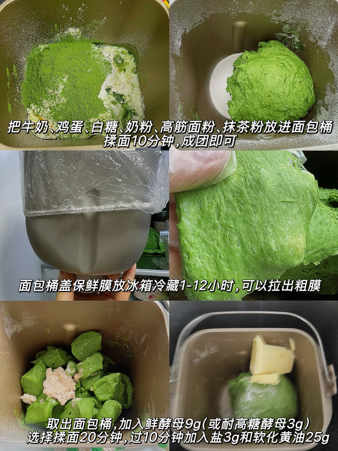 1️⃣ 把牛奶、鸡蛋、白糖、奶粉、高筋面粉、抹茶粉放进面包桶,揉面10分钟,成团即可,面包桶盖保鲜膜放冰箱冷藏1-12小时,可以拉出粗膜