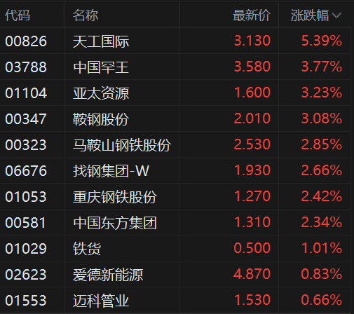 格隆汇11月25日|港股钢铁股普涨,其中,天工国际涨超5%,鞍钢股份、马鞍山钢铁涨3%,重庆钢铁股份、找钢集团、中国东方集团涨超2.3%。