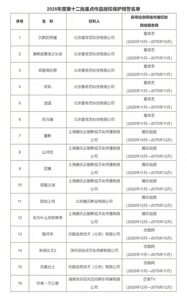 国家版权局近日发布2025年度第十二批重点作品版权保护预警名单。《沉默的荣耀》《低智商犯罪》《风与潮》《新闻女王2》等重点作品上榜。