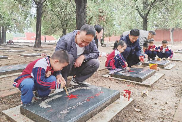 在烈士陵园,全体人员面向革命烈士墓碑默哀,深切缅怀他们的丰功伟绩。沾化区美术家协会的艺术家手把手指导学生们用毛笔蘸取适量油彩,小心翼翼描摹墓碑上的文字、五角星及相关图案,以实际行动寄托哀思、表达敬意。