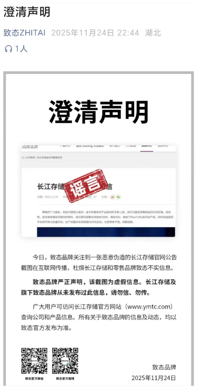 针对该传言,长江存储旗下致态品牌于11月24日在官方微信号发布澄清声明:该截图为虚假信息。长江存储及旗下致态品牌从未发布过此信息,请勿信、勿传。