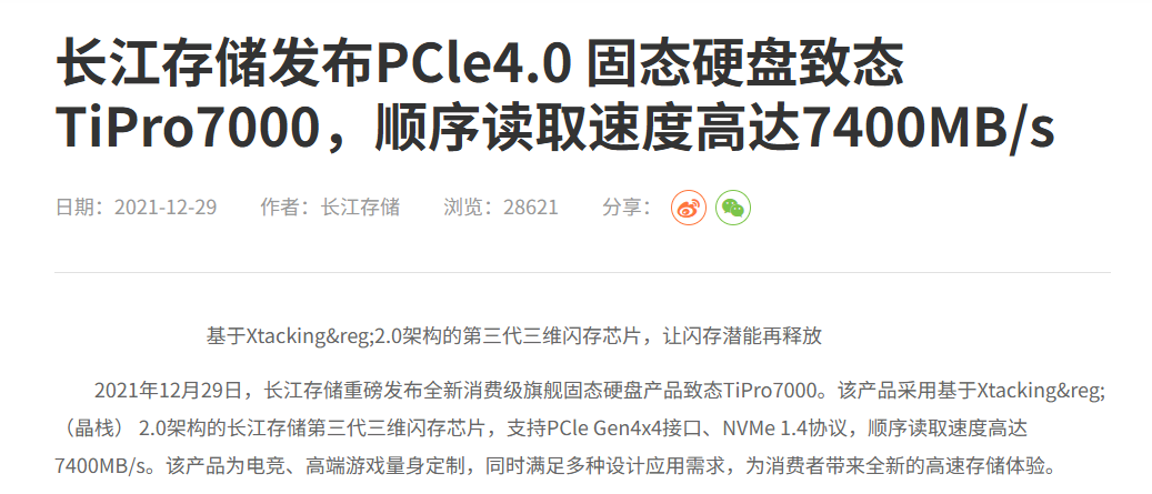 事实上,长江存储官网显示,11月10日,致态才正式发布TiPlus系列全新产品——致态TiPlus7100s固态硬盘。致态TiPlus7100sSSD的推出,旨在为追求高性能的游戏玩家与DIY用户,提供一款拥有强悍实力的存储利器。
