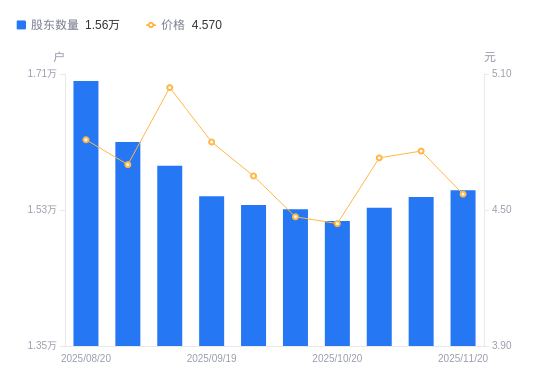 日期A股户数(户)流通A股户均持股数(股)户均持股市值(万元)2025-11-201556027026.6512.352025-11-101547227180.3712.942025-10-311533127430.3512.972025-10-201515527748.9112.322025-10-101530927469.7712.282025-09-301536727366.0912.732025-09-191548227162.8113.042025-09-101588526473.7013.342025-08-291620025958.9312.202025-08-201700624728.6111.89