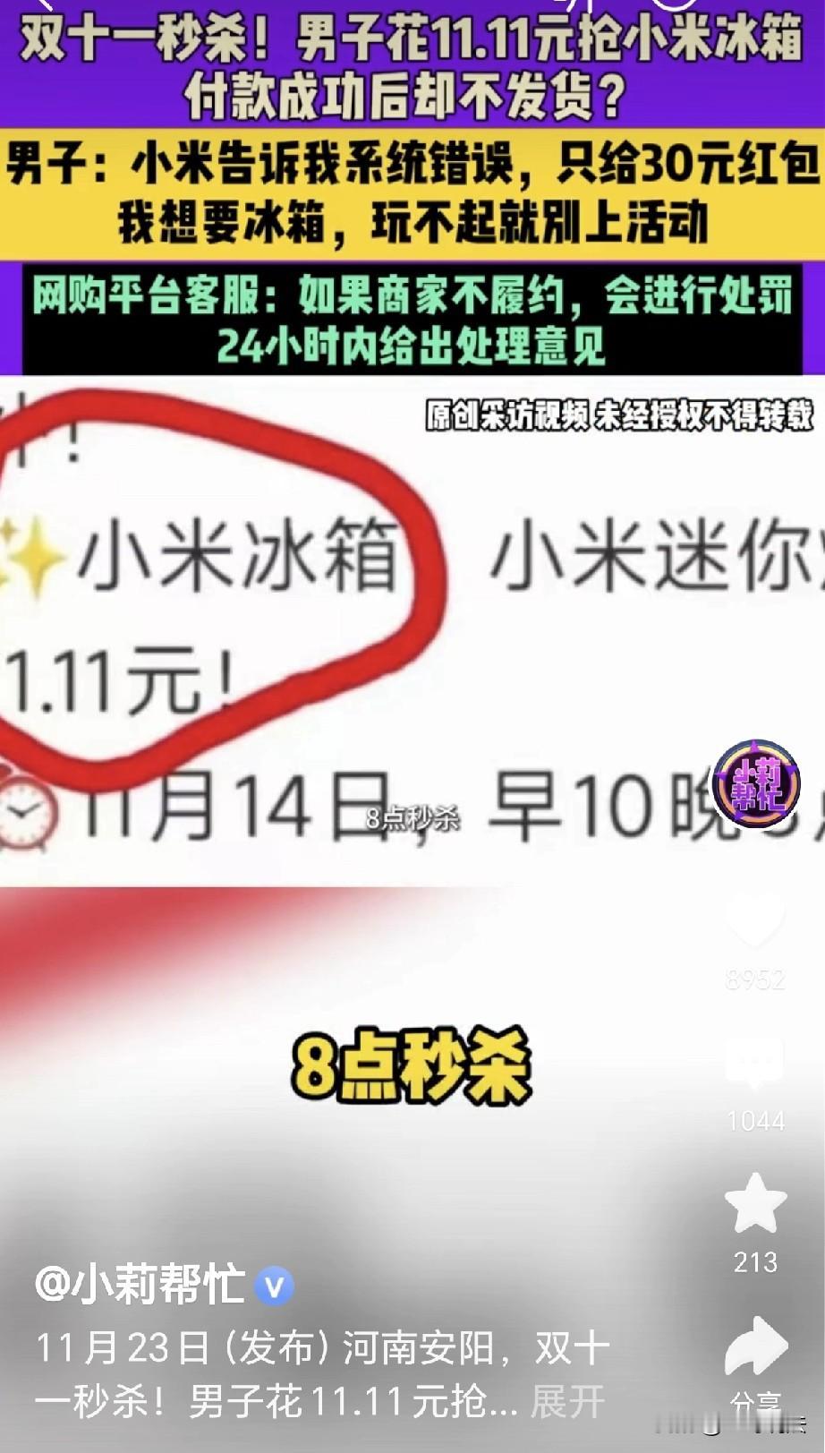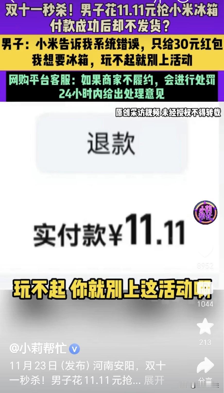 河南安阳,一男子参与双11活动,以11.11元的价格抢到一台小米冰箱,谁知等了两
