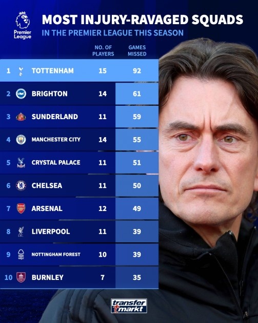 直播吧11月25日讯德转列本赛季英超球队伤病榜,热刺15名球员受伤,共计缺席92场比赛排名第一,布莱顿、桑德兰位列二三位。