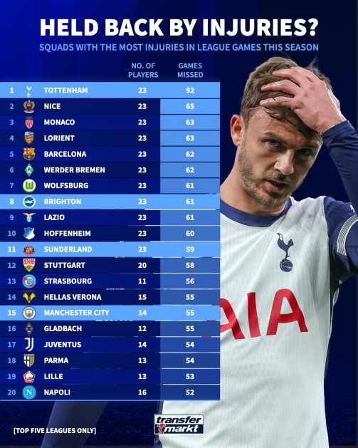 热刺也是本赛季五大联赛球员因伤缺席比赛场次最多的球队,除热刺外,本赛季五大联赛中球员因伤合计缺席场次前五的球队还有尼斯(11人,65场)、摩纳哥(12人,63场)、洛里昂(10人,63场)、巴萨(14人,62场)。
