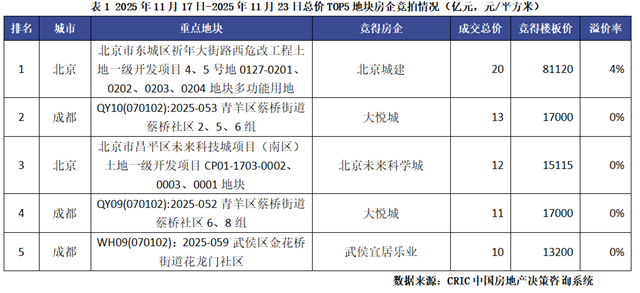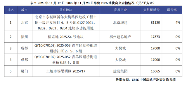 重点成交地块方面,北京二环内天坛北宅地以20.28亿成交,该地块经过38轮竞价,最终由北京城建竞得,名义楼板价8.1万元/平方米,溢价率4%。地块控规要求住宅部分占比不超过70%,住宅部分楼板价达到11.6万元/平方米。该地块由4个子地块构成,其中0127-0202子地块限高3.3米、容积率0.39,需按传统四合院形态建设并整院出售,严禁高低配建别墅及私家庄园,其余三个地块限高18米。地块位于北京二环内核心区域,紧邻天坛公园北门,向北距天安门约3公里,位置优越,且容积率低,居住舒适度高,周边交通便利,邻地铁5号线和7号线换乘的磁器口站,并有国瑞购物中心、新世界百货、同仁医院等成熟配套。地块2公里内尚无同类项目在售,在开发项目仅有西侧的金鱼池地块,该地块在2024年7月出让,容积率1.83,溢价25%成交,直至2025年7月才拿到建设批复,期房参考价为15.1万元/平方米。