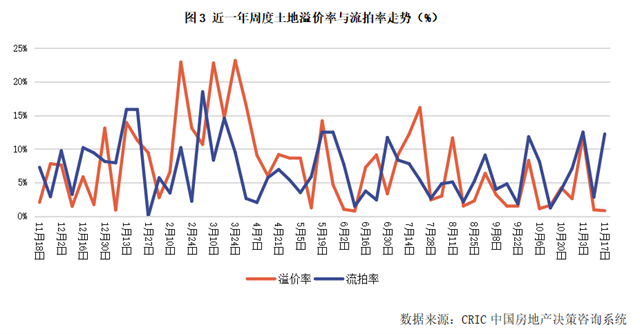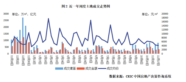 成交:本周土地成交建筑面积805万平方米,环比上升18%;成交金额326亿元,环比上升11%。本周平均溢价率0.8%,因优质高总价地块成交频次延续低位,土拍热度再创新低。