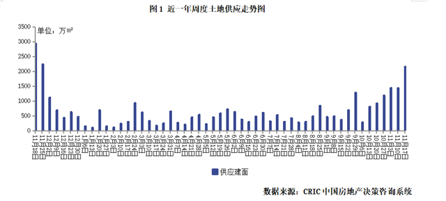 供应:本周土地供应建筑面积2153万平方米,环比上升50%,创年内新高。一线城市中北京、广州均有宅地挂牌,北京本周供应2宗含宅用地,合计出让底价108.9亿元,广州本周供应6宗含宅用地,合计出让底价99.7亿元。本周供应含宅用地共244幅,平均容积率1.86。