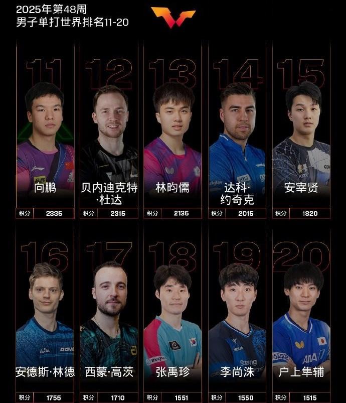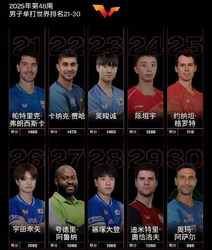 再来看其他球员,向鹏排名第11,陈垣宇排名第24,周启豪排名第38,陈俊菘排名第45,黄友政排名第48。莫雷加德排名上升1个名次位列第4;WTT球星挑战赛马斯喀特站男单冠军费利克斯·勒布伦排名上升1个名次位列第6;亚军艾利克斯·勒布伦排名上升3个名次位列第10;四强弗拉基米尔·西多伦科排名上升49个名次位列第58,并刷新了个人职业生涯排名新高。