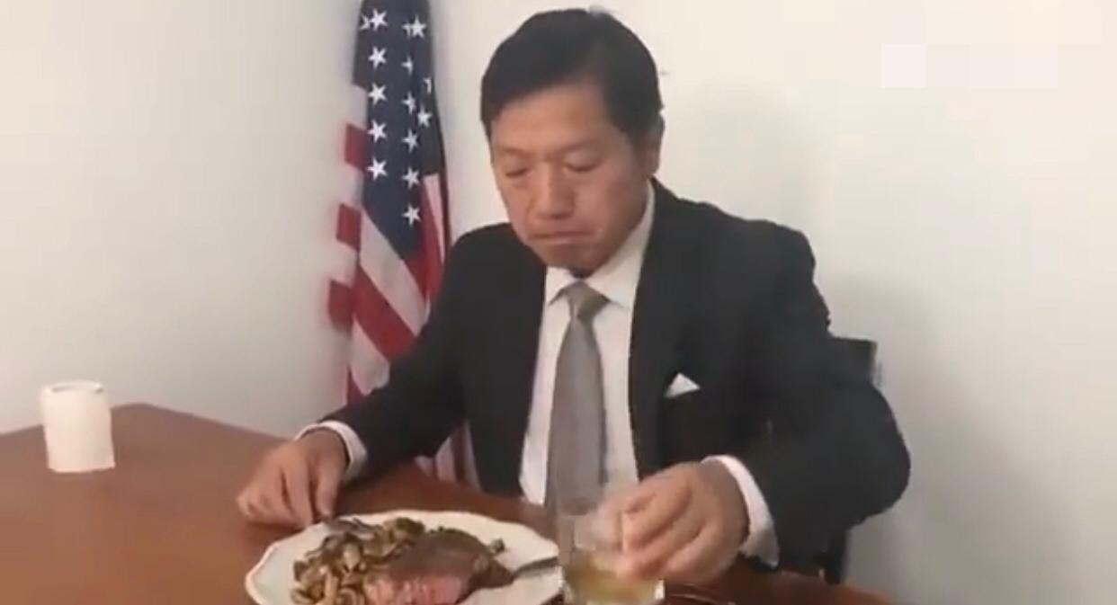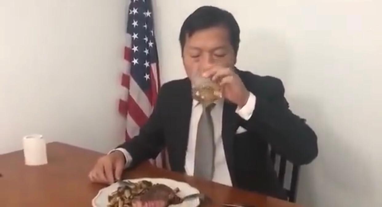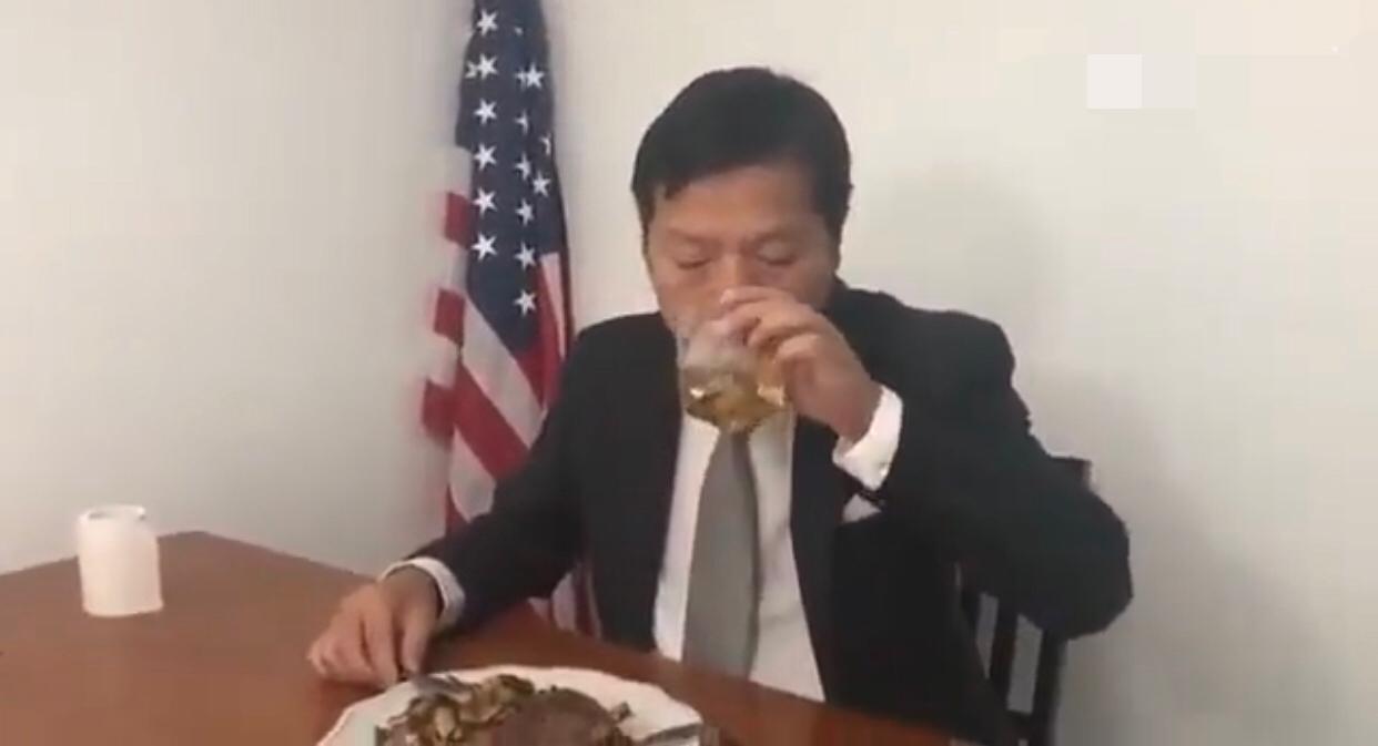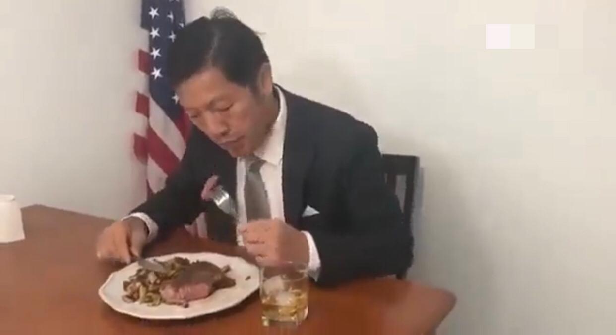 名场面:一位润到美国的华人男子,在美国地下室吃牛排。 只见这位润人,穿着一身西装、打着领带,坐在桌前,桌上放着一个盘子,里面是一块不大不小的牛肉,和一副刀叉,盘子两边分别放着一卷卫生纸和一杯啤酒,在他的背后是一面美国旗。 只见他拿起刀叉,一块一块的切着牛排叉起来吃,一小口一小口的细嚼慢咽,在配着一口啤酒,做出享受吃牛排的惬意模样。 他当初于2018年卖掉北京的房子,带着老婆和孩子义无反顾的润到美国,就是为了享受一顿美国地下室牛排吗?! 或许,他拍这个视频就是要告诉大家,他选择到美国没错,至少能在美国地下室享受自由民主的牛排,在别的地方不见得有这个待遇。