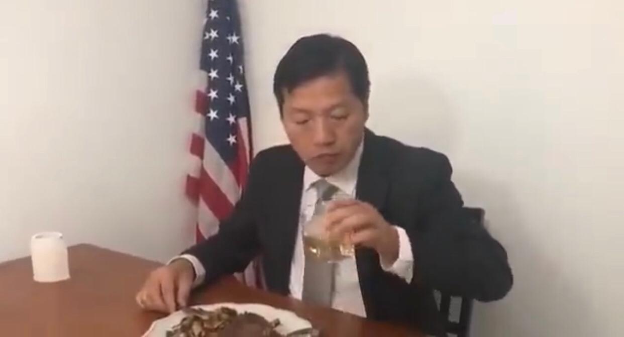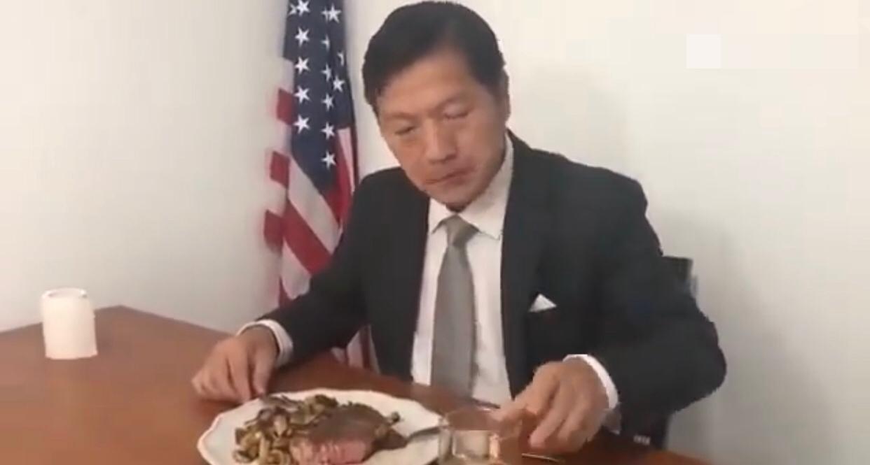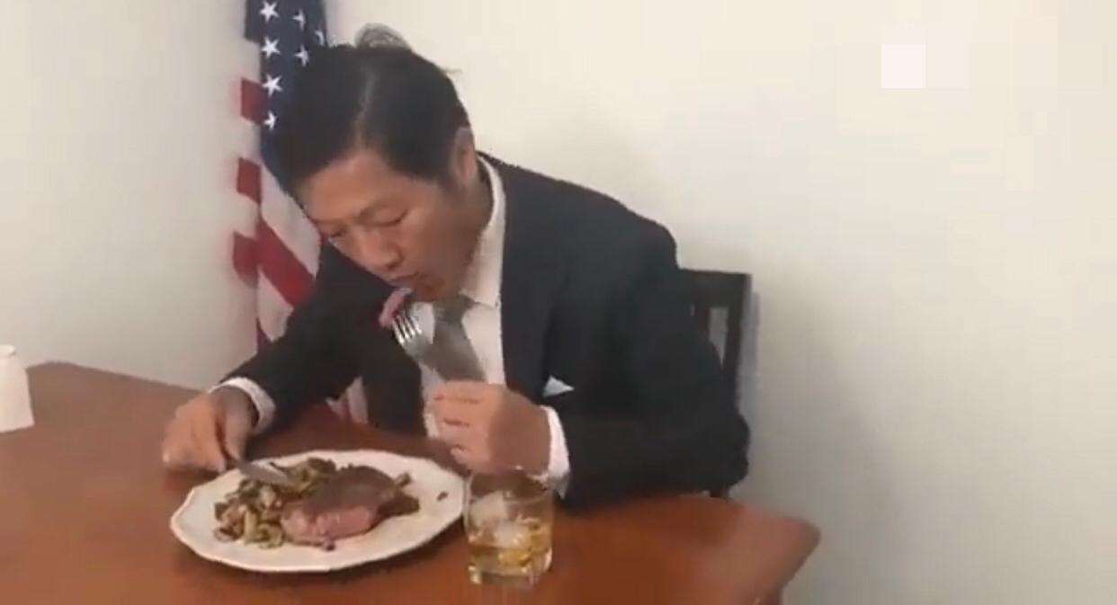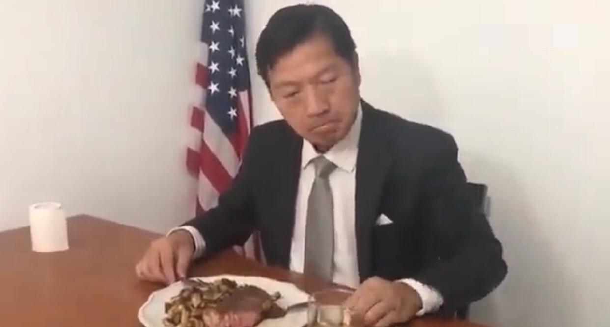 名场面:一位润到美国的华人男子,在美国地下室吃牛排。 只见这位润人,穿着一身西装、打着领带,坐在桌前,桌上放着一个盘子,里面是一块不大不小的牛肉,和一副刀叉,盘子两边分别放着一卷卫生纸和一杯啤酒,在他的背后是一面美国旗。 只见他拿起刀叉,一块一块的切着牛排叉起来吃,一小口一小口的细嚼慢咽,在配着一口啤酒,做出享受吃牛排的惬意模样。 他当初于2018年卖掉北京的房子,带着老婆和孩子义无反顾的润到美国,就是为了享受一顿美国地下室牛排吗?! 或许,他拍这个视频就是要告诉大家,他选择到美国没错,至少能在美国地下室享受自由民主的牛排,在别的地方不见得有这个待遇。