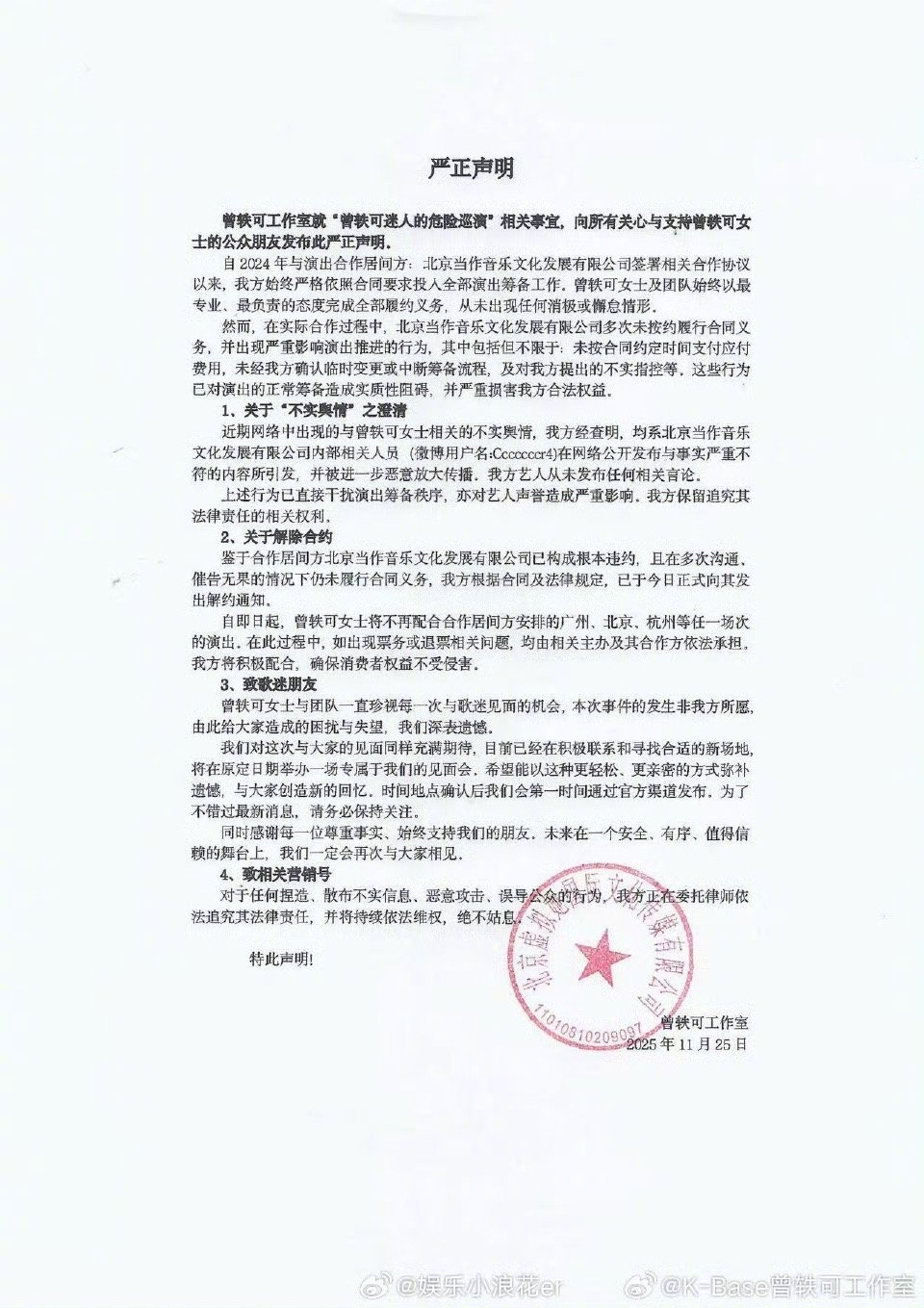 曾轶可工作室发声明,就“曾轶可迷人的危险巡演”相关事宜做出声明,请大家理性吃瓜吧