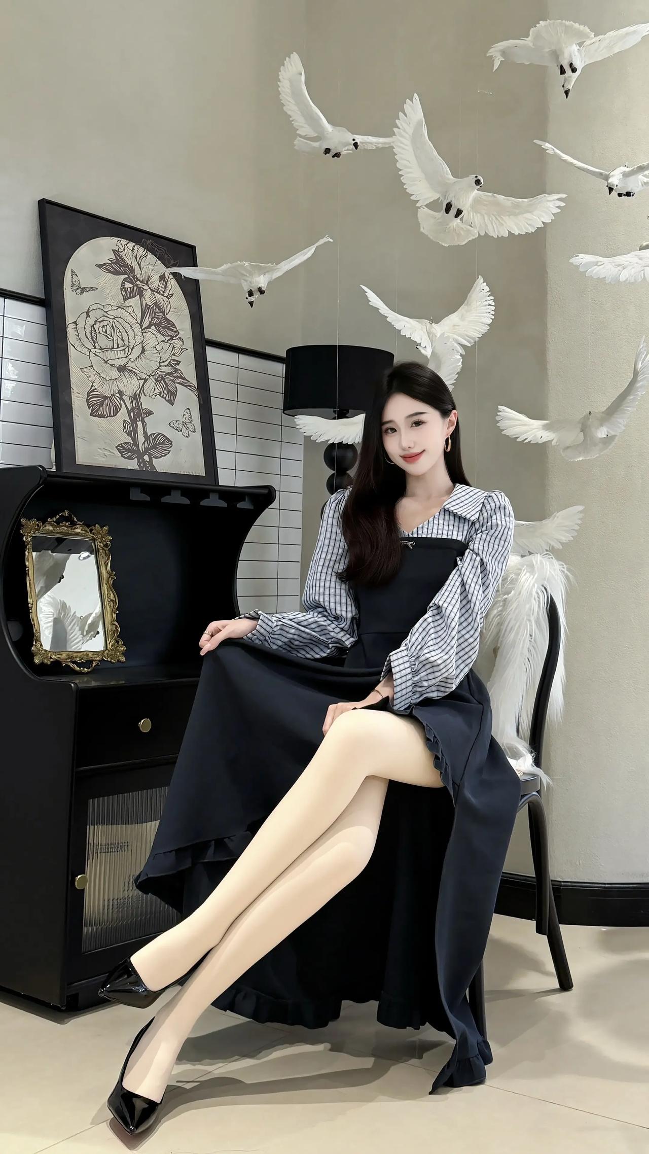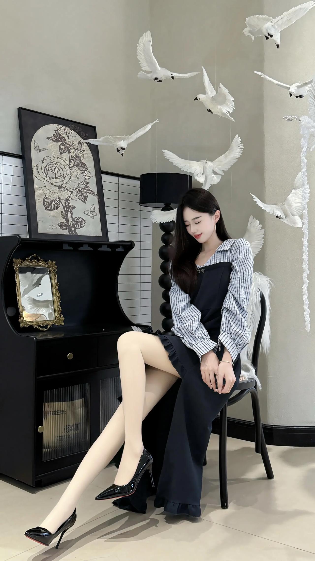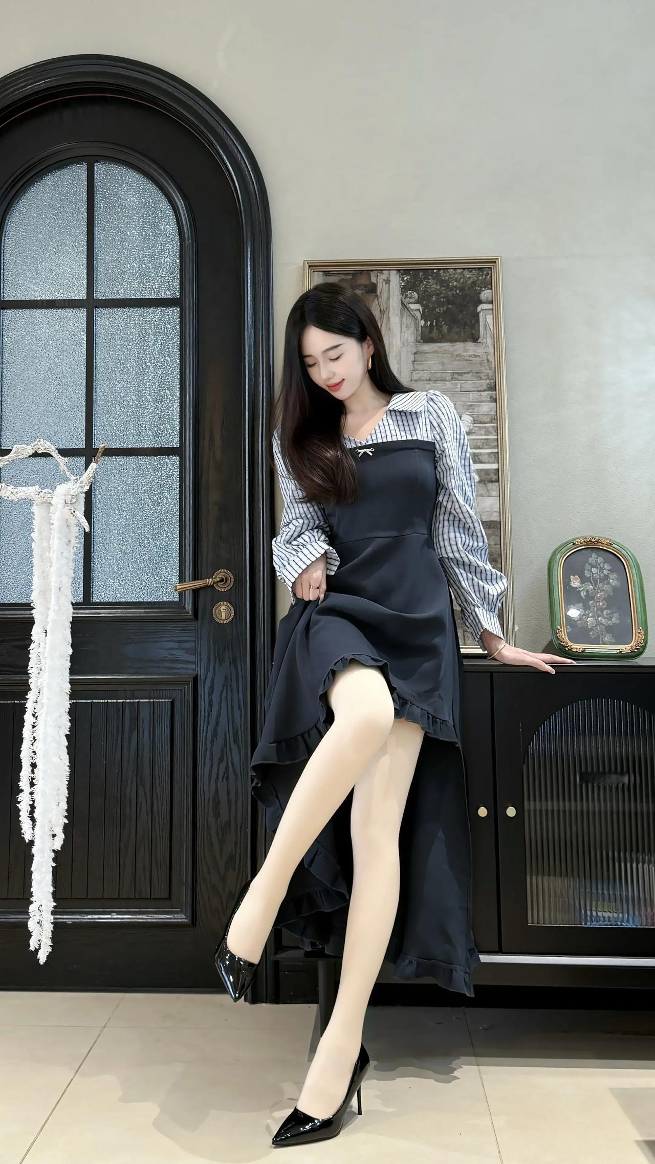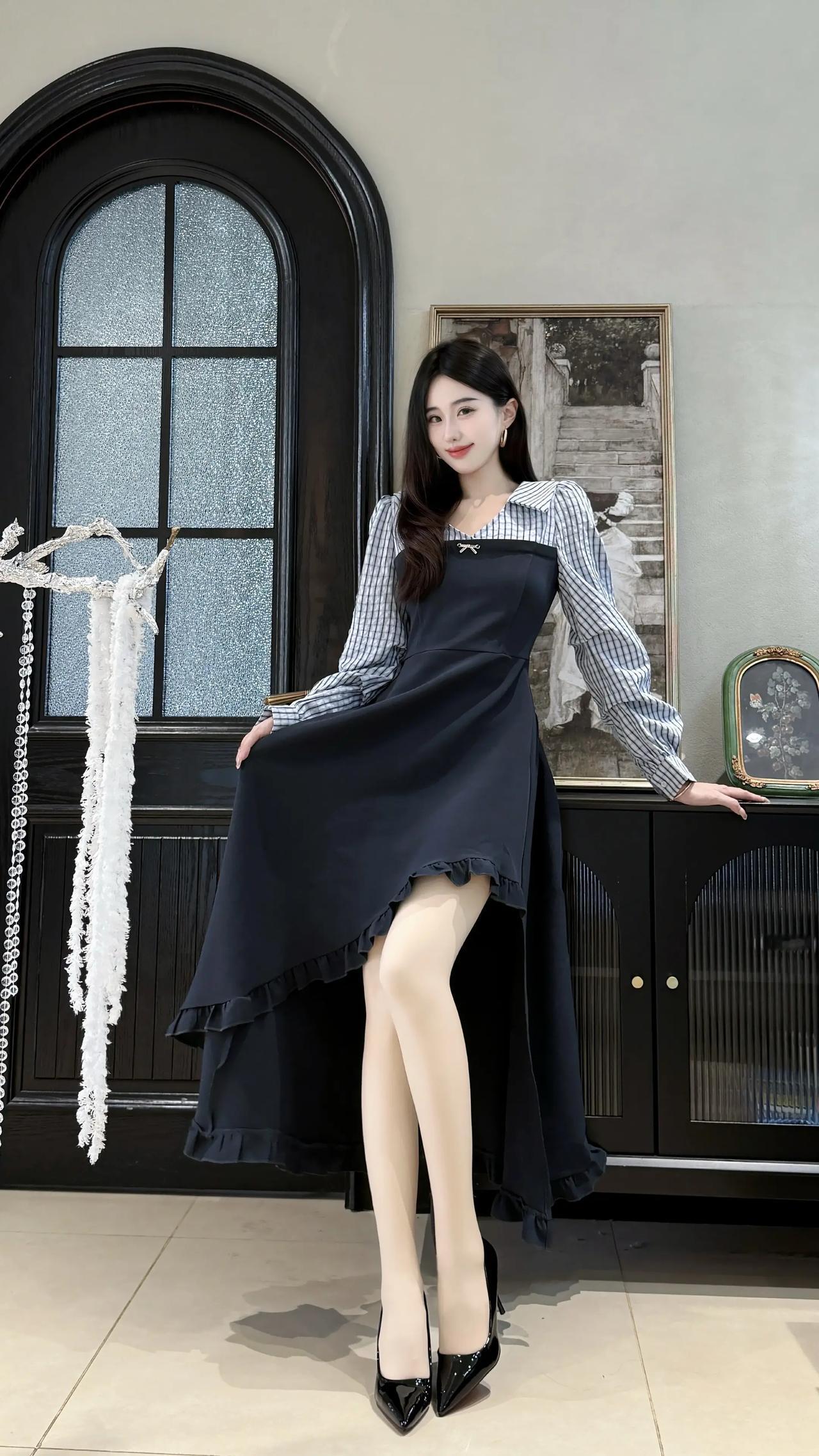 藏蓝色连衣裙,我愿称之为穿搭天花板! 灰格子长袖显手臂纤细,黑色高腰+不规则裙摆,显瘦又灵动。 搭双黑色高跟鞋,优雅知性直接溢出屏幕! 背景艺术感十足,和穿搭超配,整个人美得像从画里走出来。今日穿搭