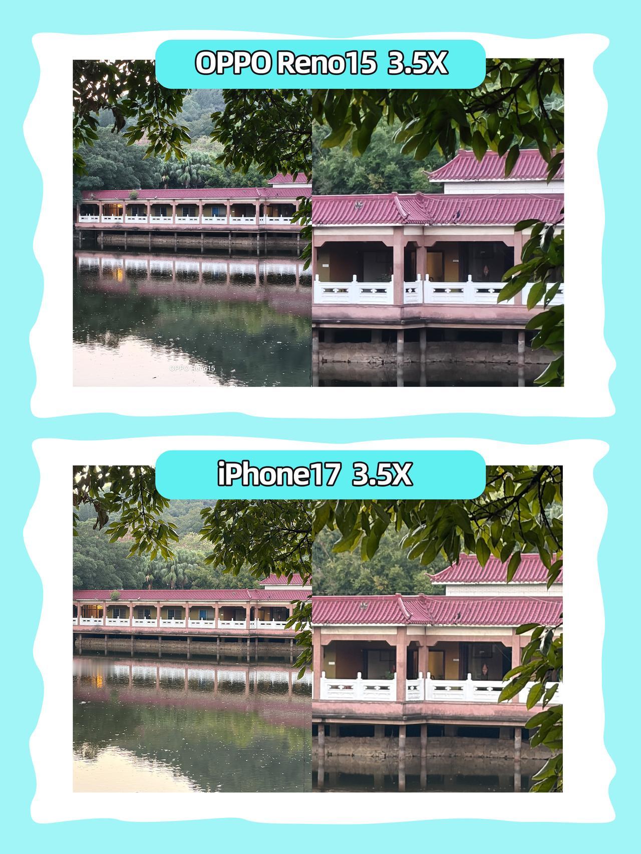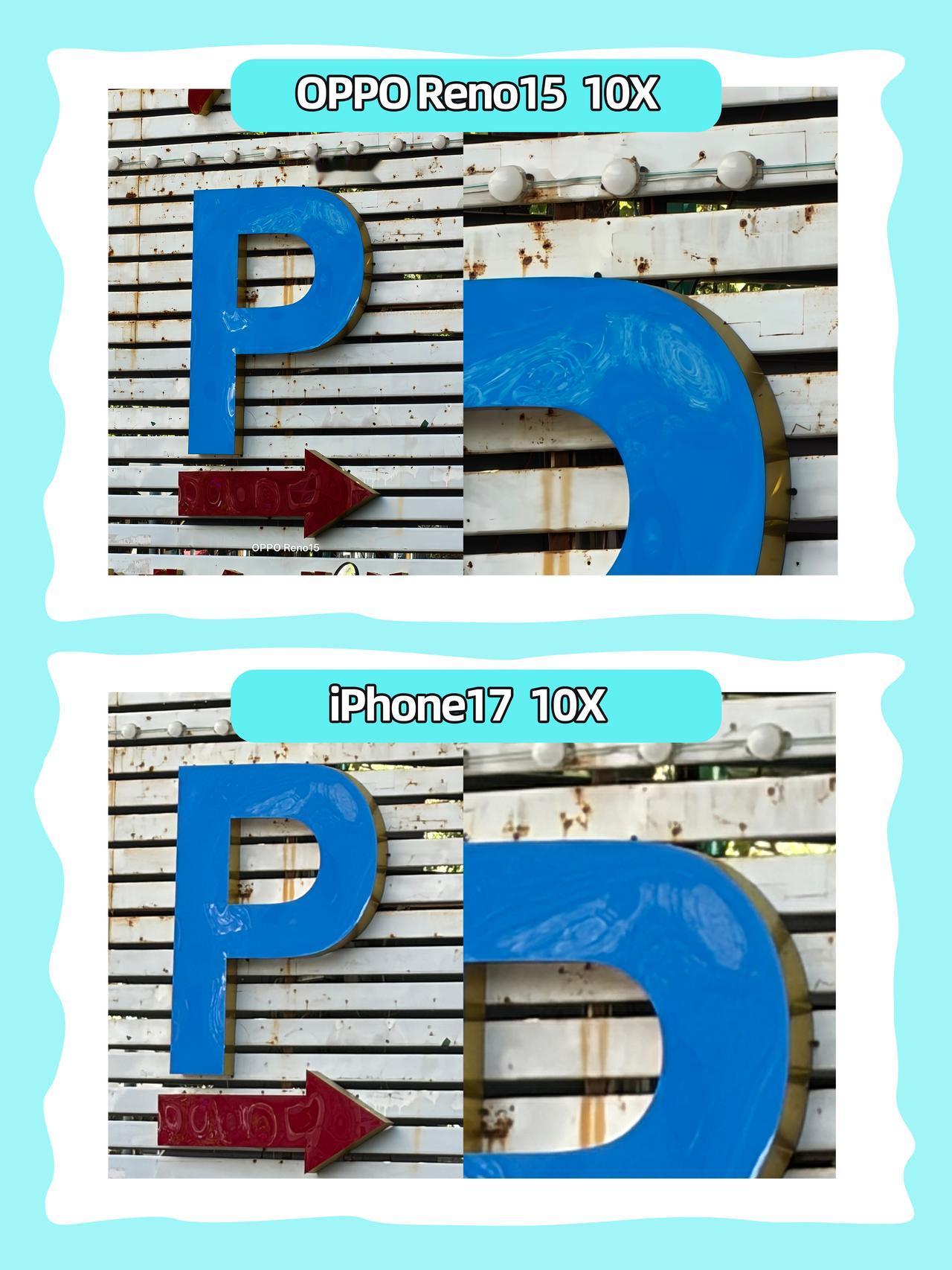 有潜望长焦和没有,📸拍照差距太直观了! iPhone 17你让我在朋友面前颜面尽失!!😭 周末跟朋友出去玩,他拿OPPO Reno15跟我iPhone 17对比远景拍照,结果真把我给整乐了, 📸同样角度、同样倍数放大,价格更低的Reno15,拍远处的建筑、路牌,清晰度明显要比ip17强不少 就算是放大10倍,🔍建筑的纹路细节也都清清楚楚 库克到底打算什么时候给标准版安排上潜望长焦镜头啊!!! 现在的双摄全靠数码变焦硬拉,在远景面前成片效果是真的不行 还有实况功能,现在OPPO也踩在苹果肩膀上发扬光大, 不仅能拍更清晰的4K live,甚至还能一键做“出圈拼图” 果粉是真的馋了 OPPOReno15 手机拍照对比 潜望长焦真香 实况照片玩法