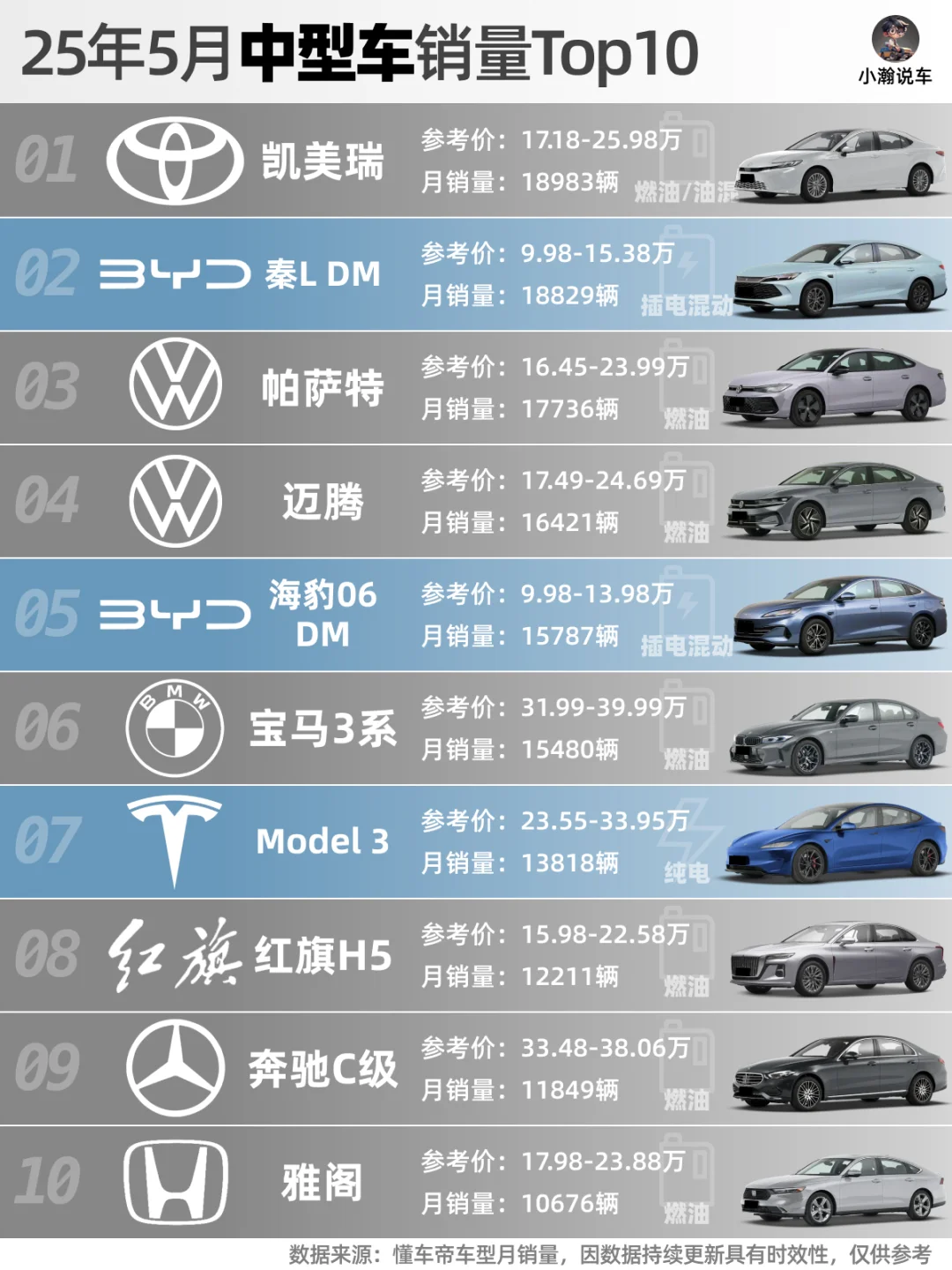 🌟中型车:丰田凯美瑞登顶,比亚迪两个998“工业奇迹”均进入前五,Model3重回中型车榜前10!