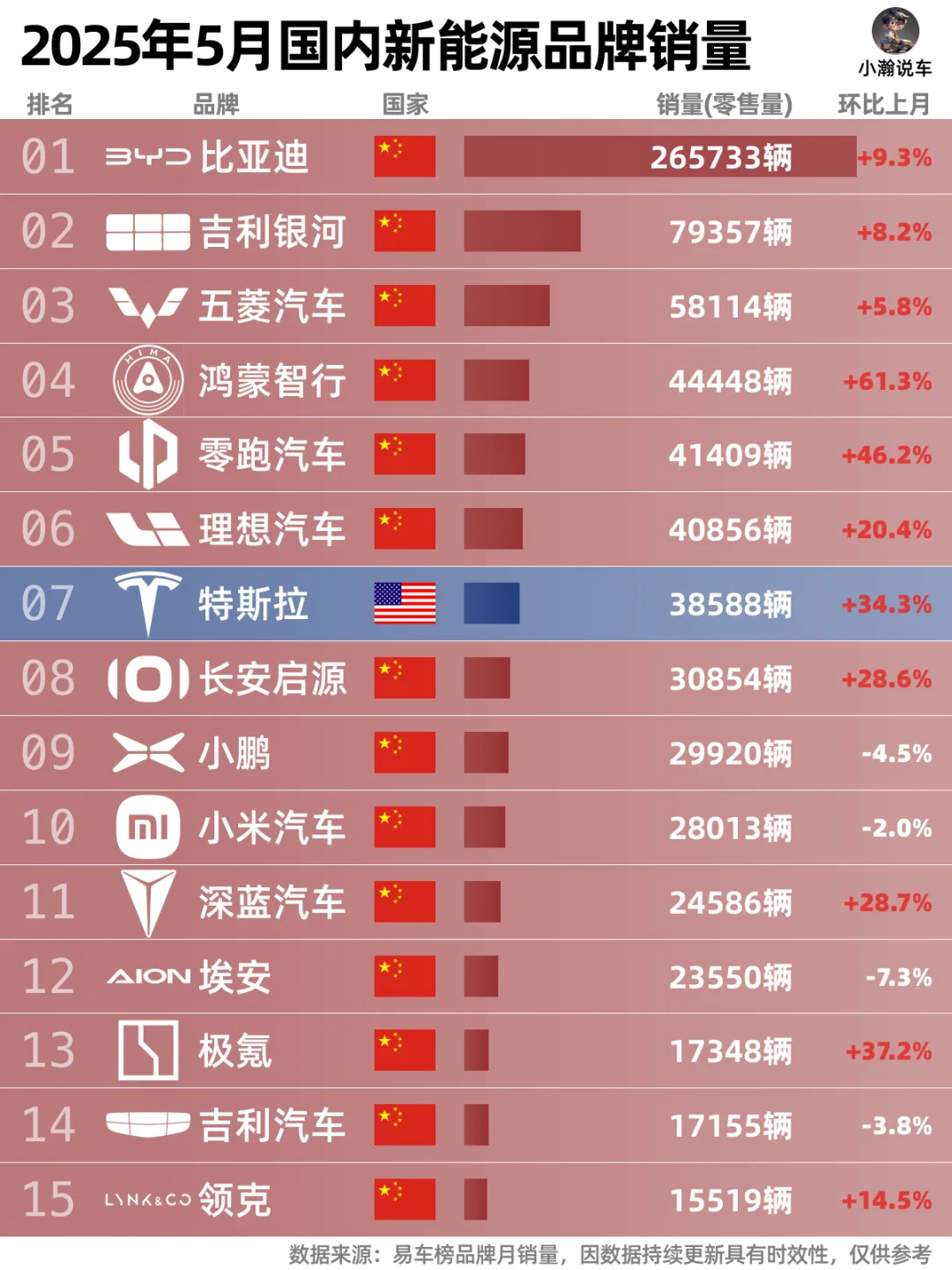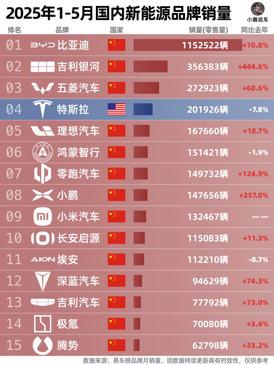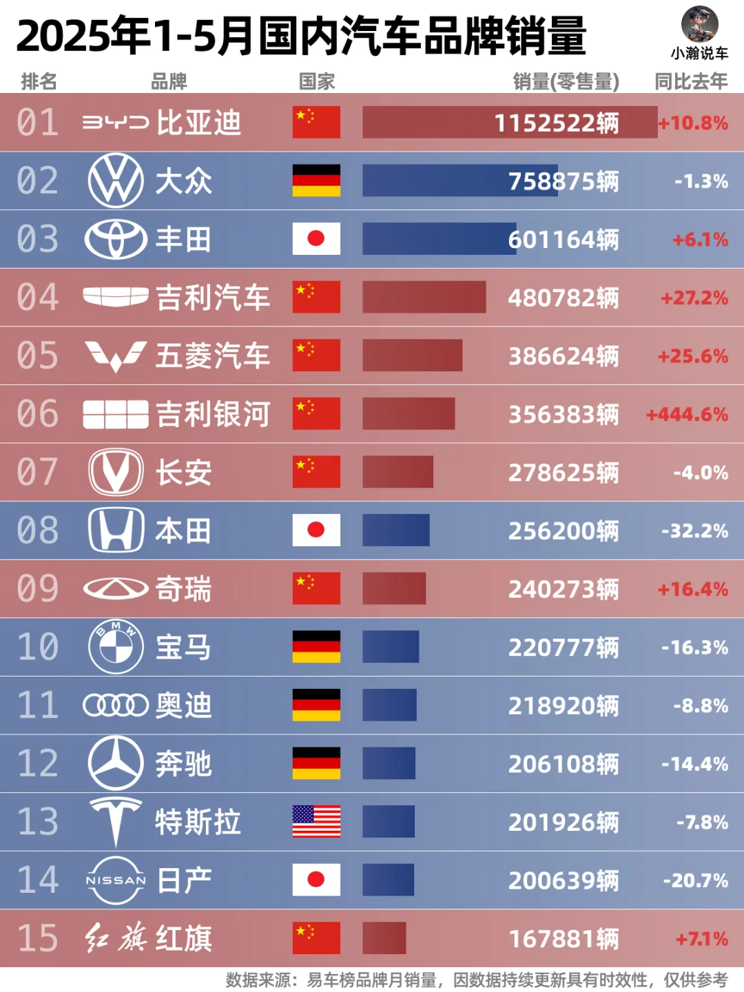 25年5月各品牌销量正式出炉,和小瀚一起来看看各家的表现: 🌟比亚迪虽仍稳居销🏆,但同比去年仅10%的增长显然不能让迪王满意!马上的一场价格战让整个行业瑟瑟发抖!当然,价格战的结果是吉利、五菱、奇瑞等车企份额的上升!相比之下,本田日产、BBA甚至特斯拉前5月销量下滑明显,拥抱国产供应商谋求转型基本上已经成了合资品牌们的共识! 🌟新能源榜依旧非常红,国产品牌们一片飘红。新能源革命很残酷,但只要不断有新技术的突破与量产上车,新能源车成为主流指日可待!