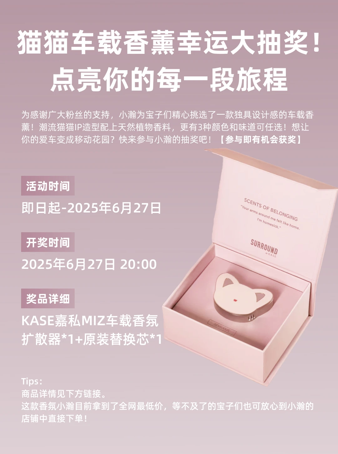 在做🚗汽车类内容分享已经一年多了。很感谢能让我在工作之余有机会表达些对于这个行业的思考和态度,更佳开心真的有帮不少粉丝朋友避开“韭菜🚗”选到了满意的座驾! 今天给大家带来一款精致🐱猫猫车载香氛! 🎁福利奖品:市值309元的KASE嘉私MIZ车载香氛扩散器*1+原装替换芯*1(颜色&香型任选) 🎉幸运宝子:3人