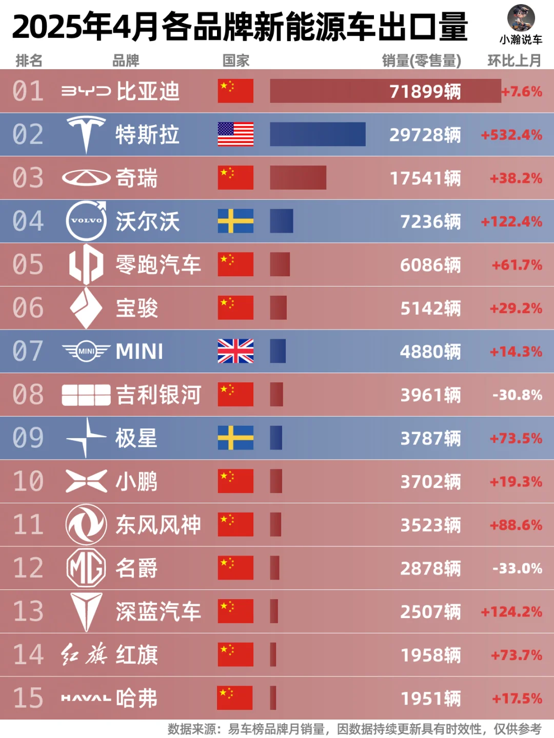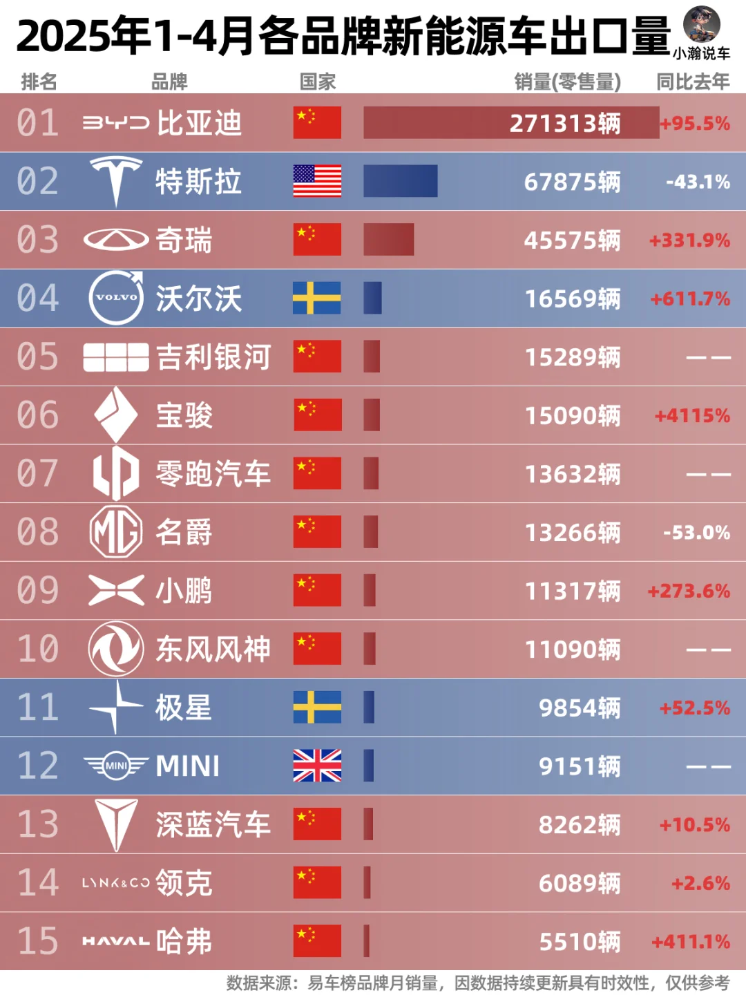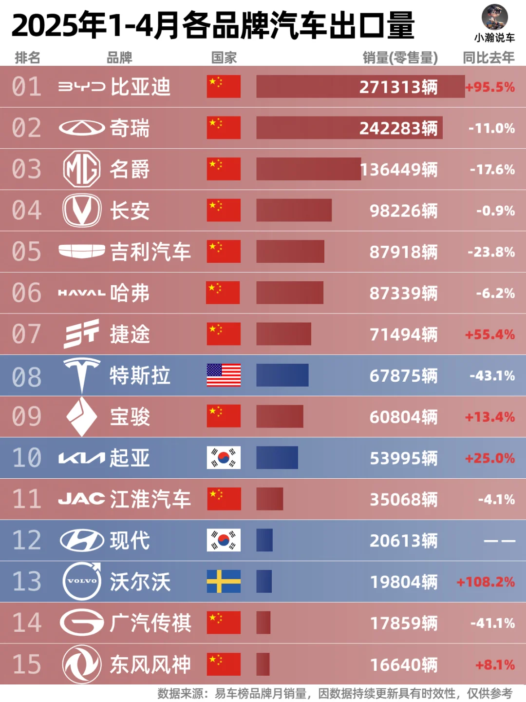 🌟比亚迪仍力压奇瑞,连续4个月稳坐出口No.1!受益于宋Plus、海狮07、海鸥等车型在海外的强势表现,比亚迪今年的海外销量势必会创造历史新高! 🌟然而国际贸易环境的复杂也确实让不少车企品牌遭遇寒冬。吉利、长安旗下主品牌4月出口量均出现超20%的下跌! 🌟而在市场波动中,零跑、银河、小鹏等以造纯电车型为主的新势力凭借技术创新成了“超级黑马”!如此看来,中国汽车出海的明天,你是更看好燃油车还是新能源车呢?