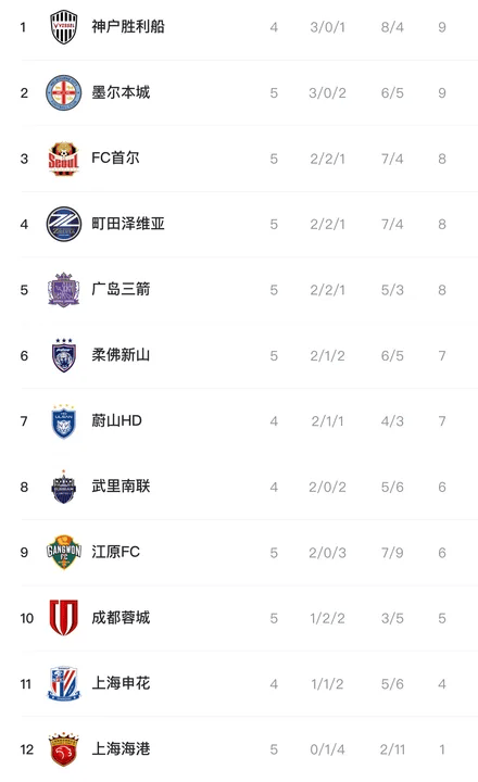 虎扑11月25日讯2025-2026亚冠精英联赛小组赛已战至第5轮,第5轮仍在进行中。截至目前,实时积分榜显示:神户胜利船少赛一轮占据榜首位置,墨尔本城本轮取胜,升至第2;