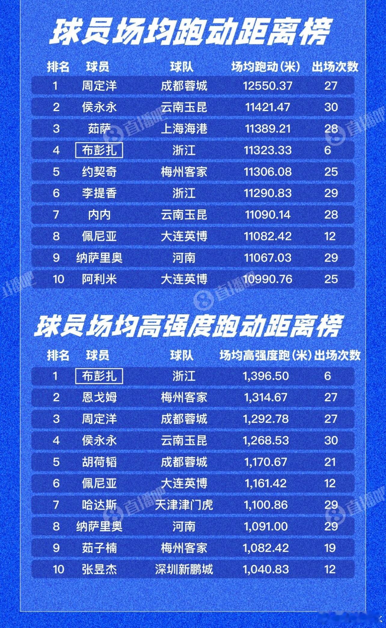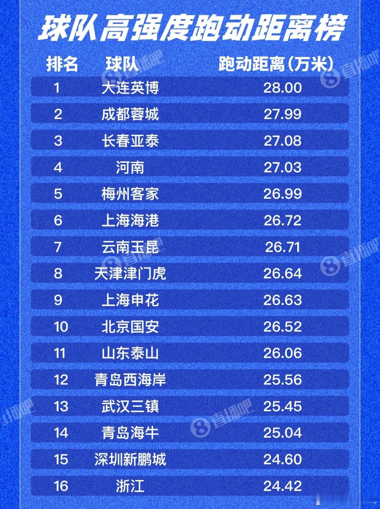 2025中超联赛,直播吧公布的数据:球队跑动距离榜, 倒数第一,球队高强度跑动距
