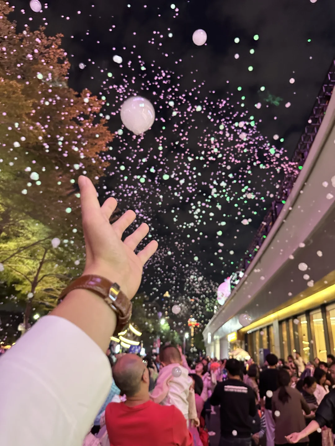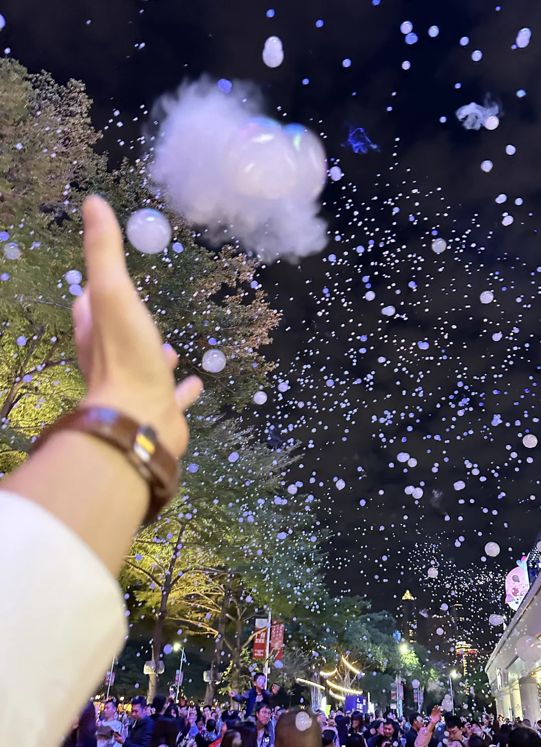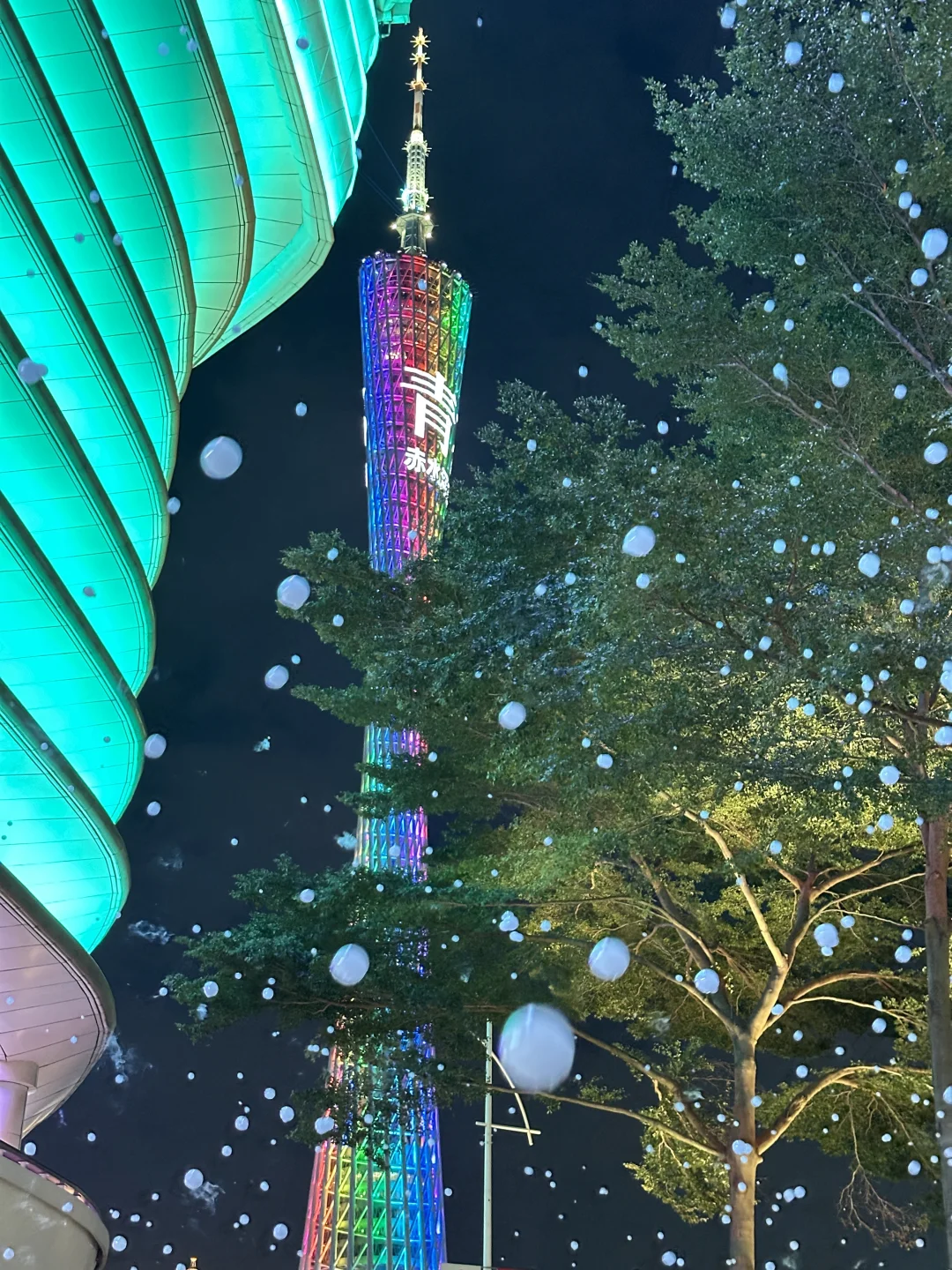 逛了15分钟就解锁人生第一次泡泡雨!刚走到海心沙亚运公园体育馆后面,8:45准时飘起漫天泡泡,梦幻到失语~ 大大小小的泡泡在灯光下泛着彩虹色,和远处的广州塔同框,随手一拍都是壁纸级照片!📸 我站在泡泡雨里呆了20分钟,忍不住伸手接泡泡,看着它们落到掌心瞬间消散,突然觉得“有些美好就该好好欣赏,不必强求留住”,这体验真的太治愈了。