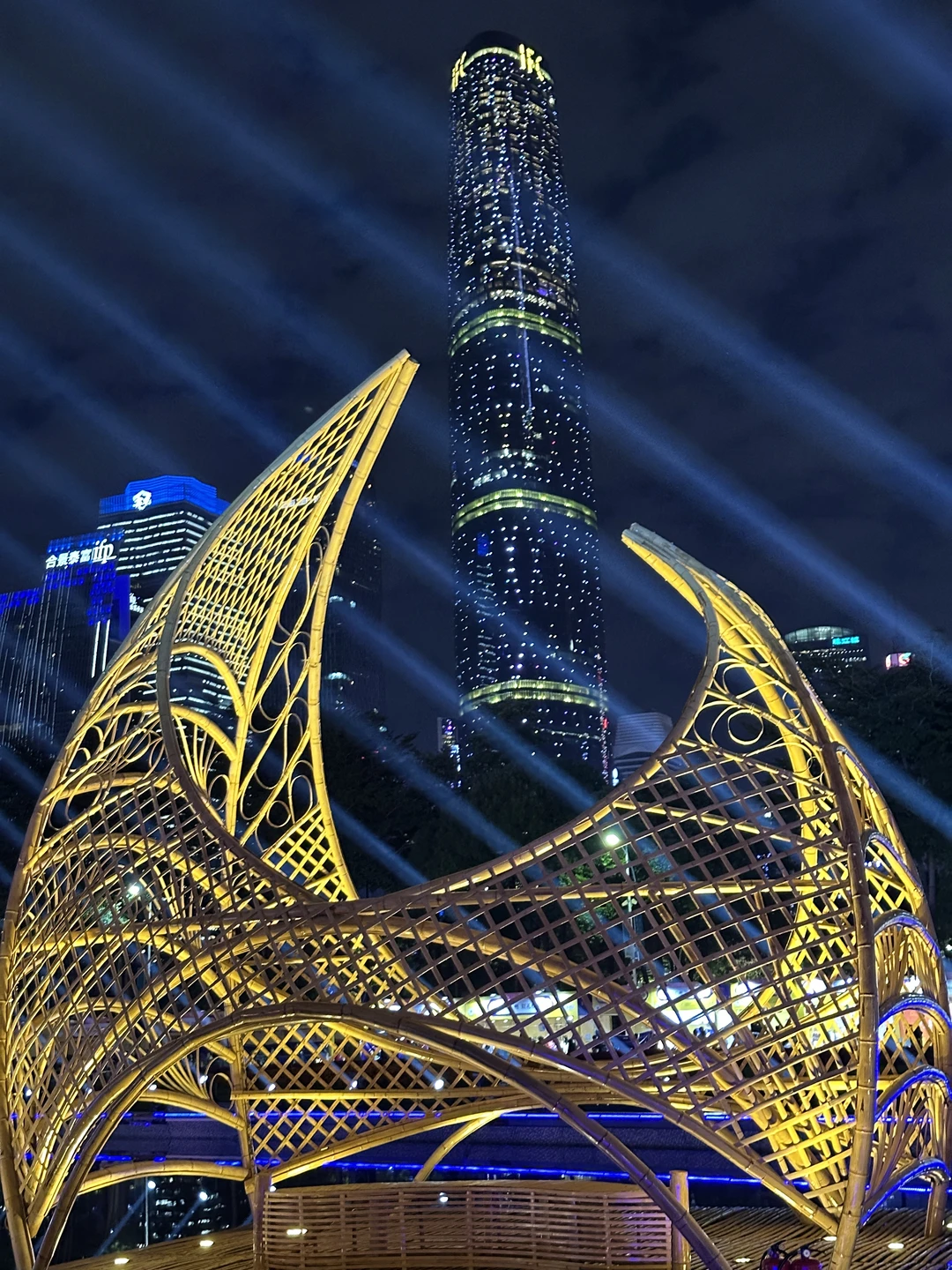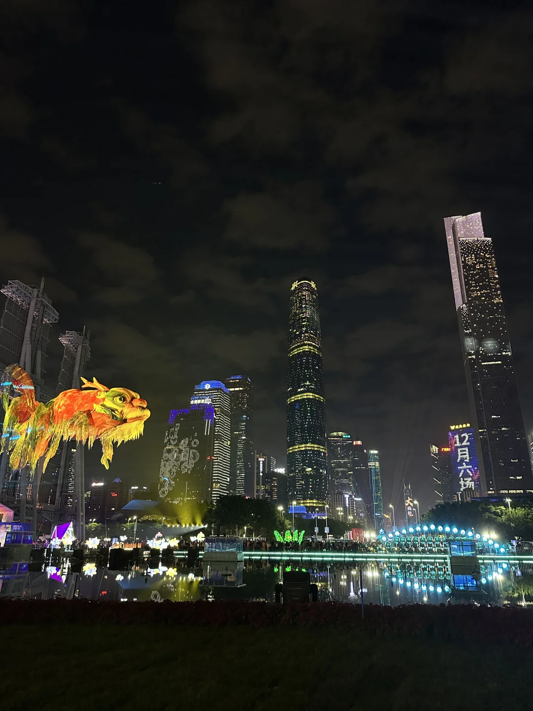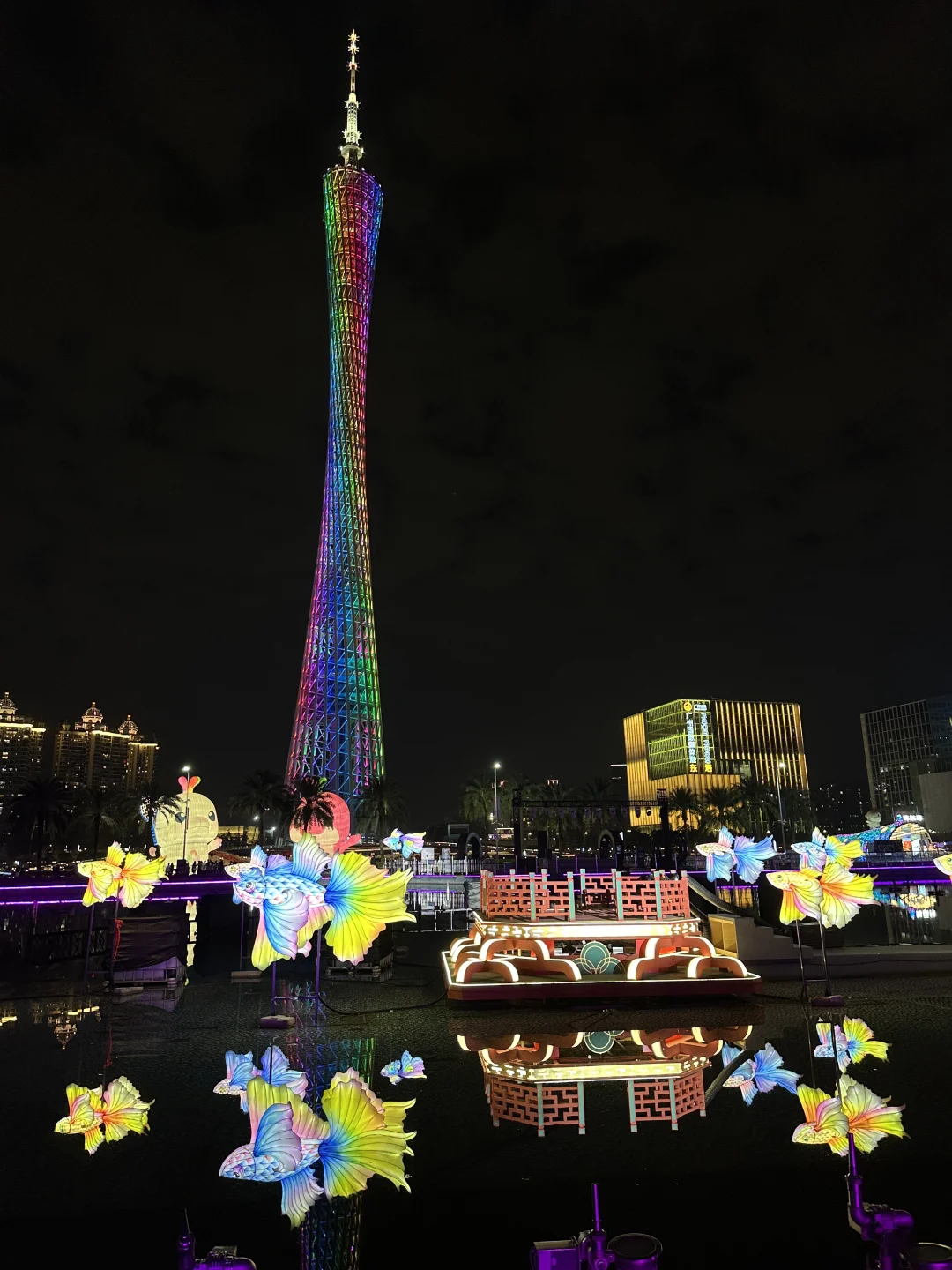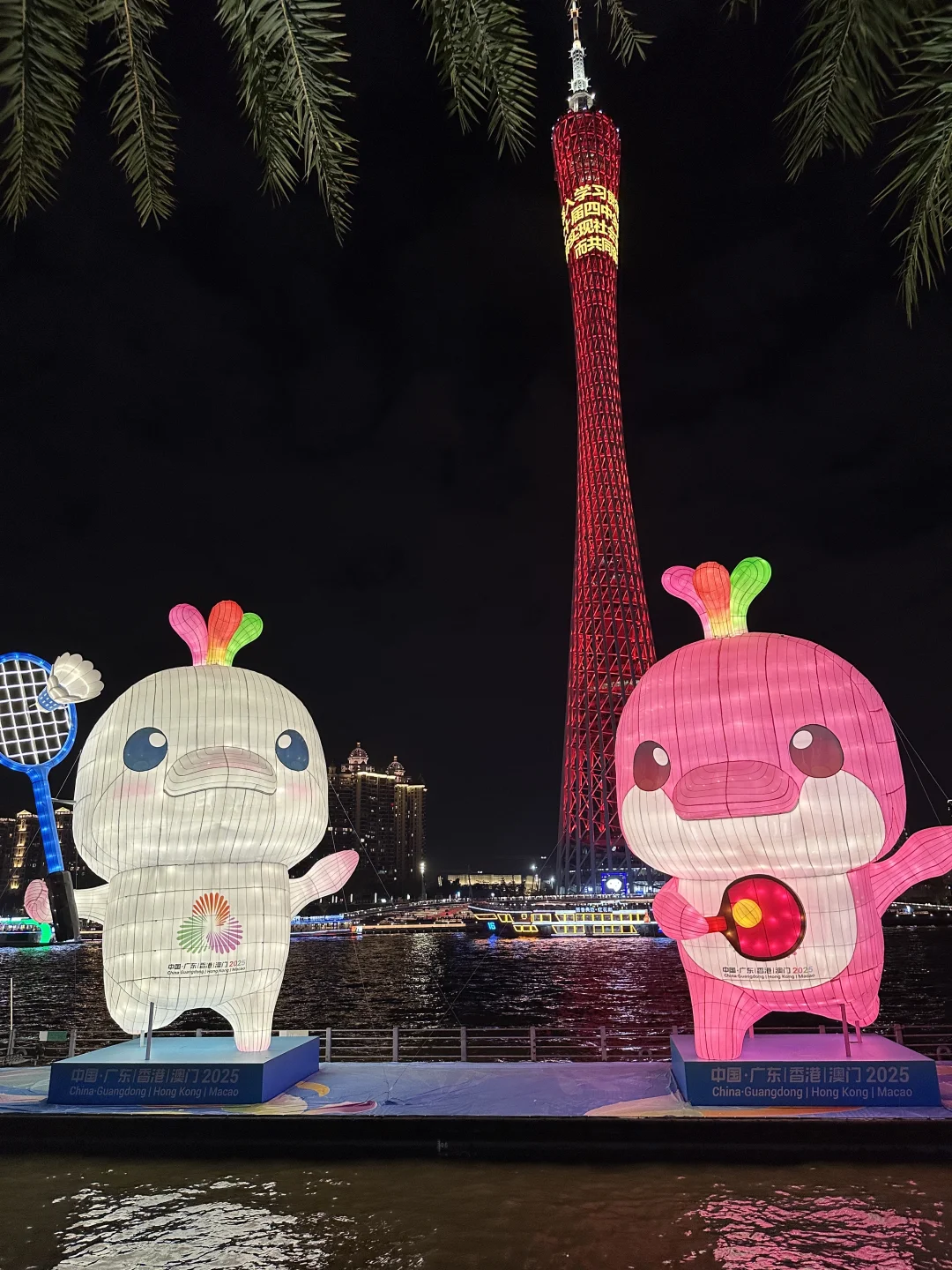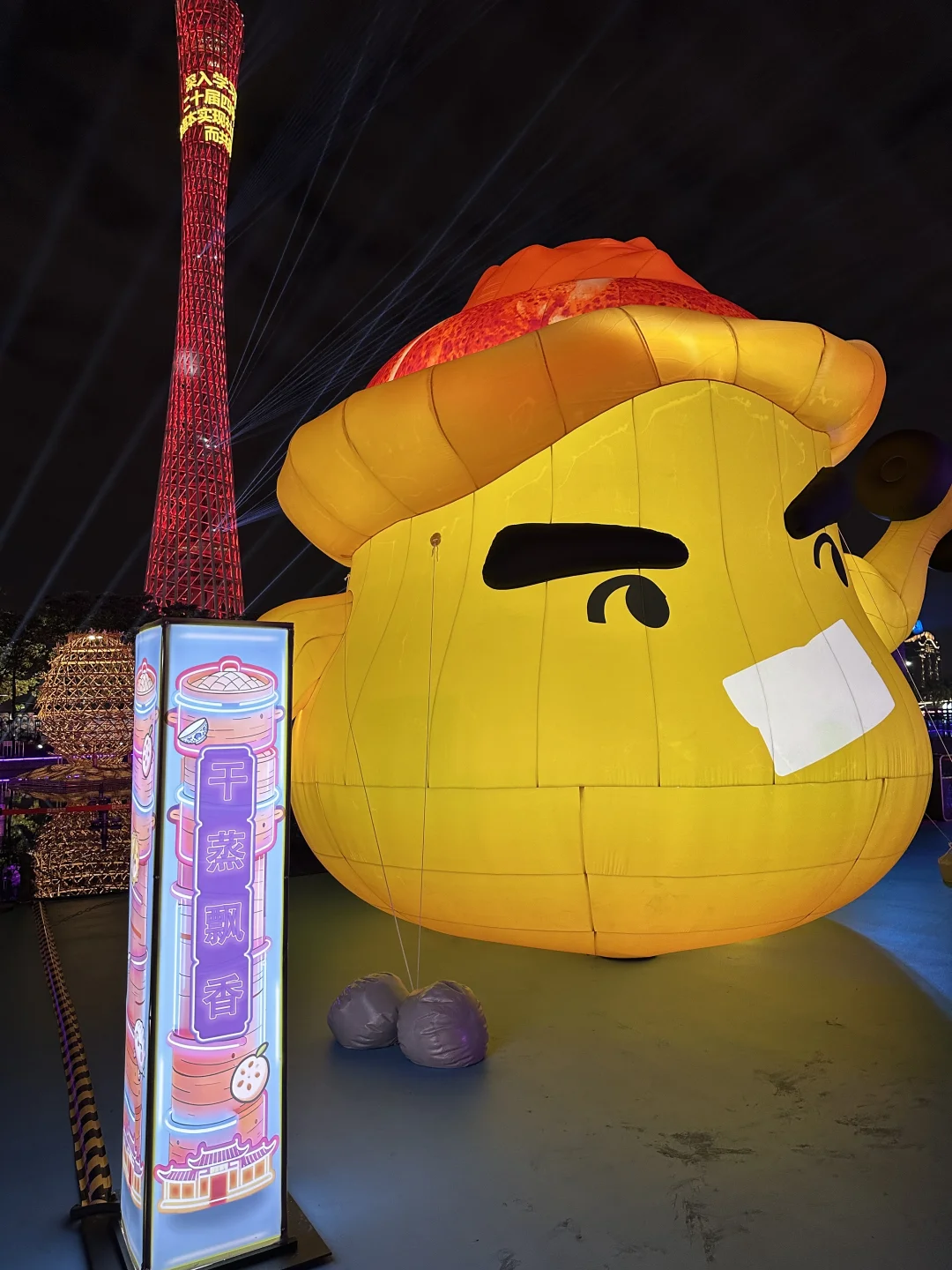 终于见到心心念念的全运会吉祥物鳌鱼!开了灯的鳌鱼在夜色里超亮眼,和东西塔同框拍出来巨出片,完全不用找角度。一路往中心平台走,还解锁了肠粉、菠萝包、油条造型的吉祥物,圆滚滚的超可爱,妥妥的广州特色,忍不住每种都拍了九宫格!