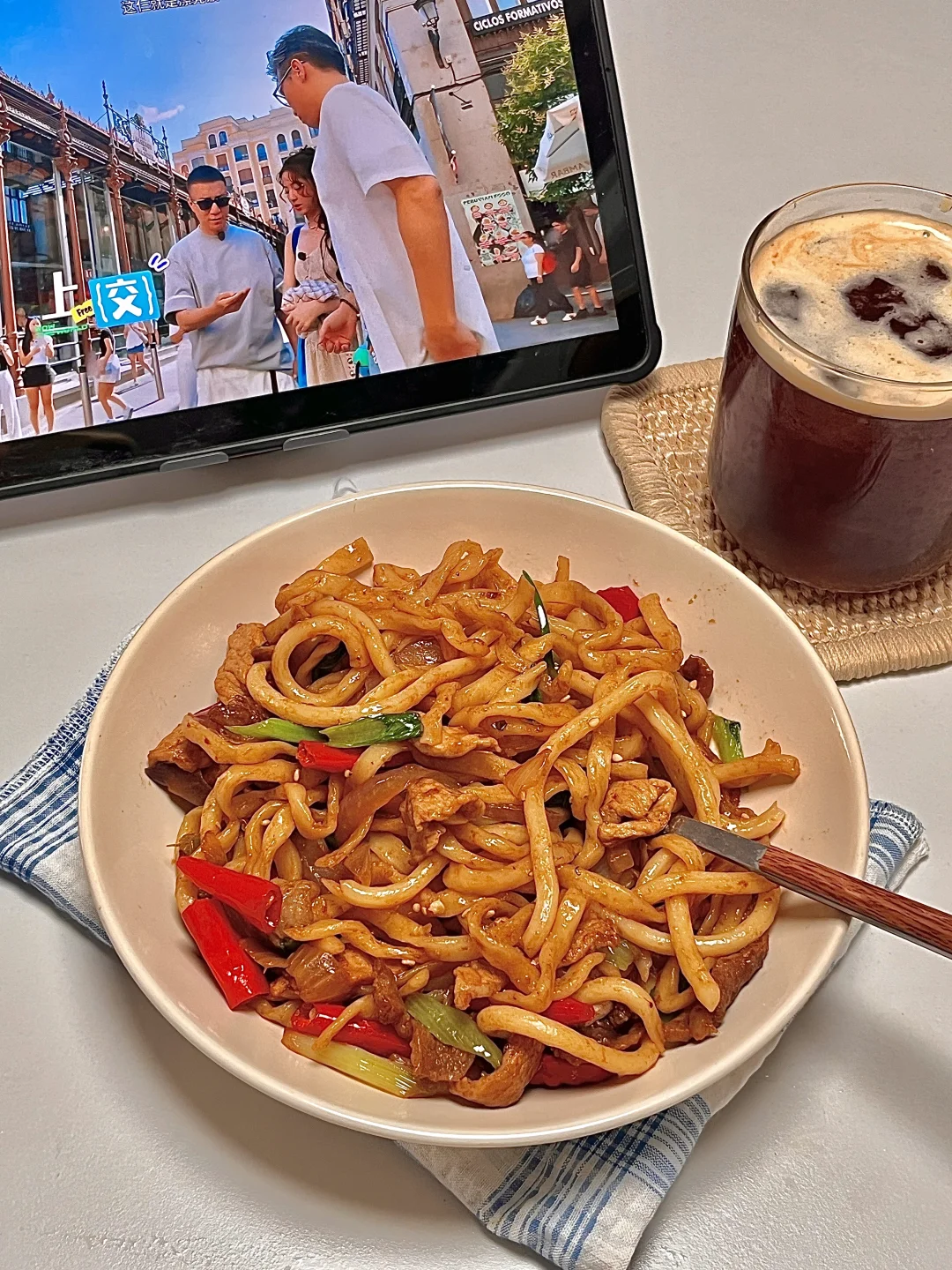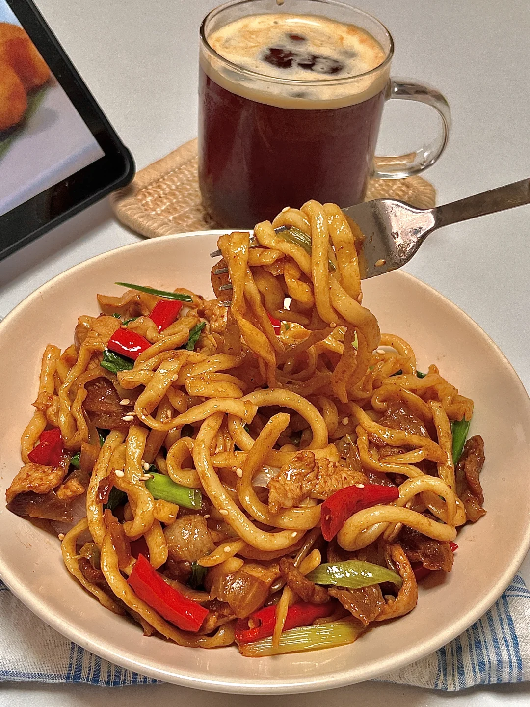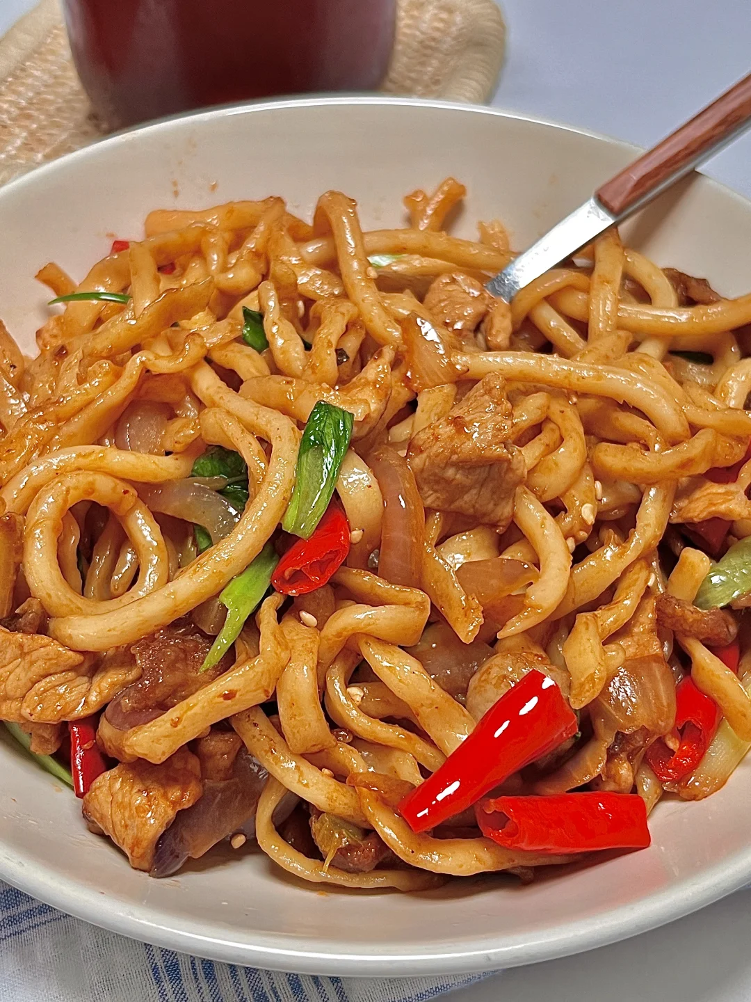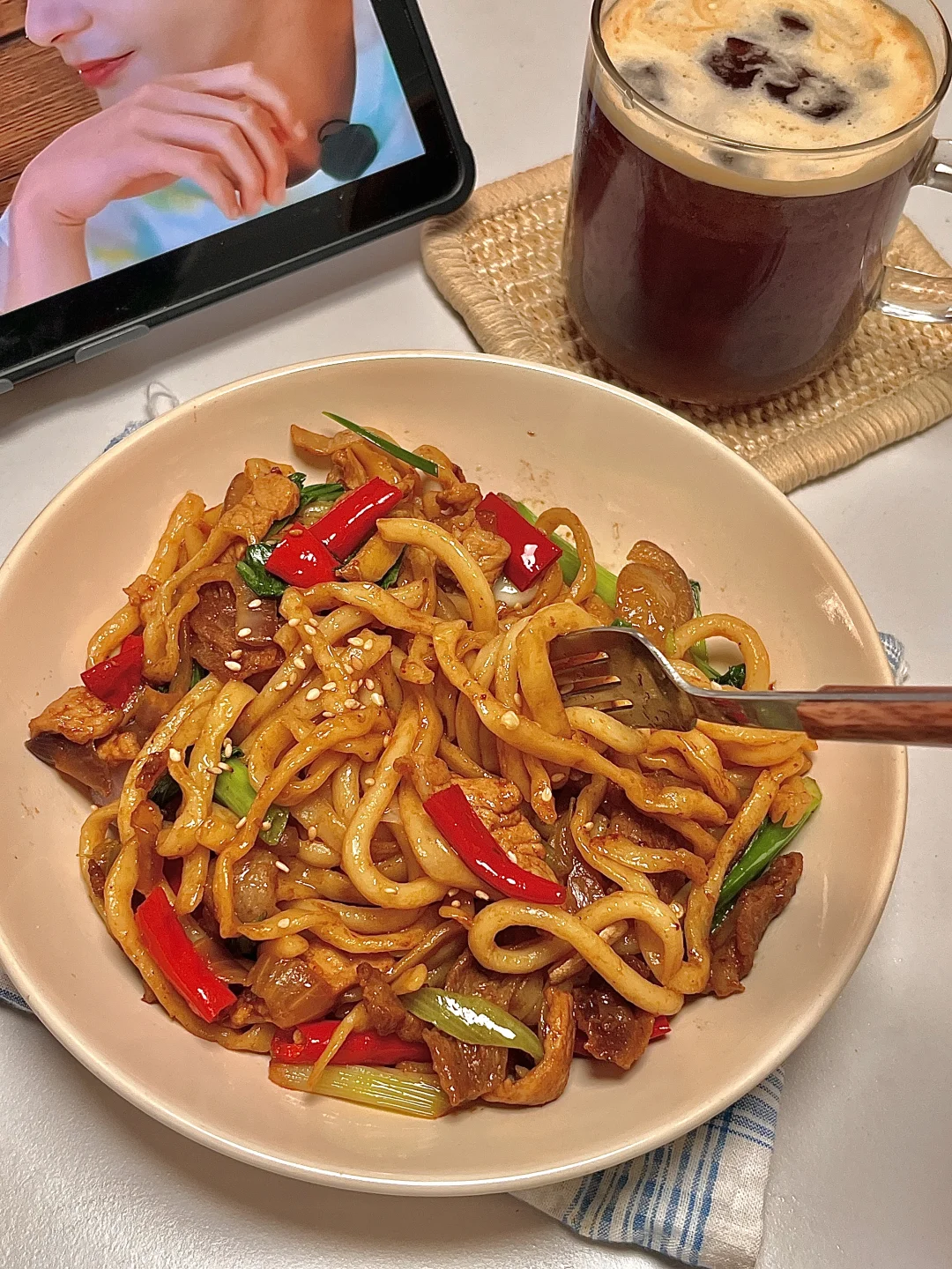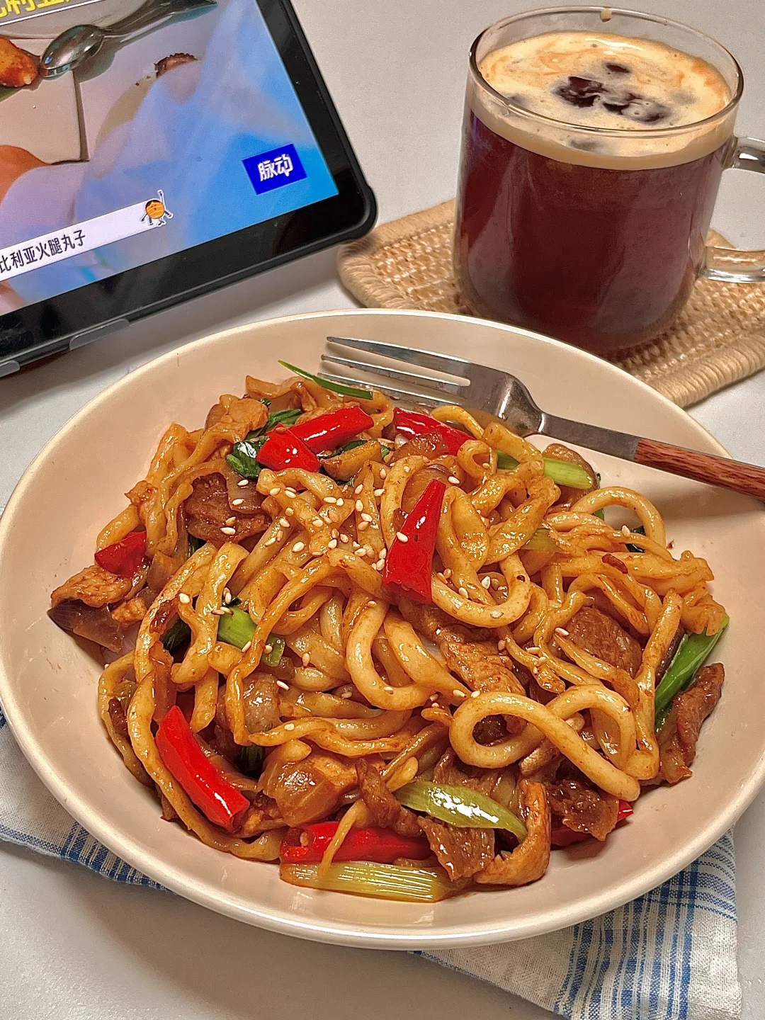 🍴今日份一人食: 干煸肉片炒面 美式 . 我可太爱这种浓油赤酱的炒面了,干煸肉片炒面你就做吧,又香又辣,贼过瘾🤤巨好吃😋加上简单的配菜 一份特香的炒面就成了!爱吃的宝一定要去试试呀✌🏻