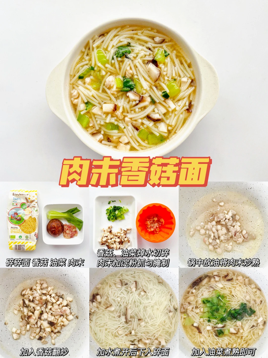 2.锅中放油将肉沫炒熟,在加入香菇翻炒,加水煮开后加入碎碎面。