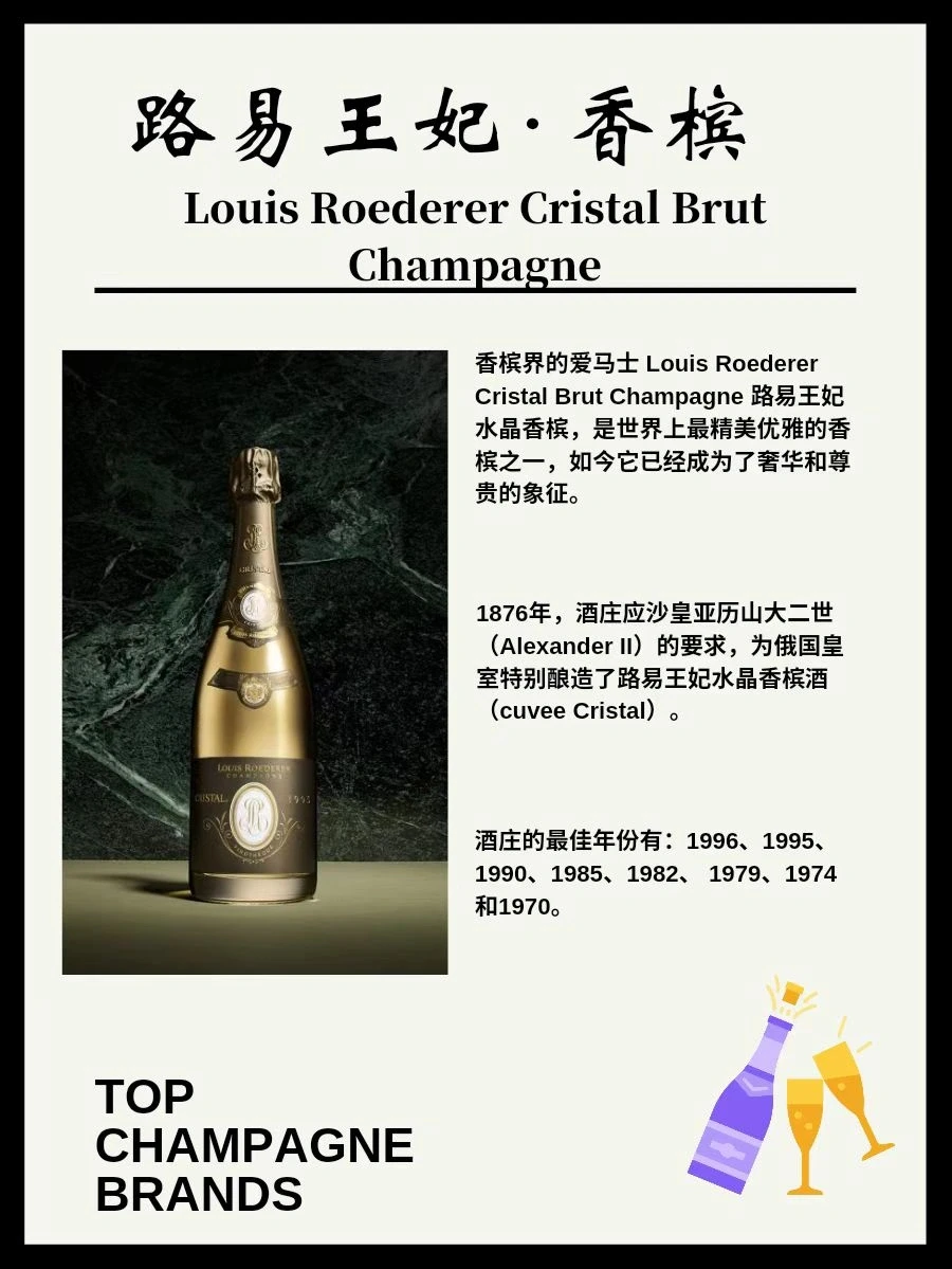 🥂俄国沙皇亚历山大三世非常喜爱香槟,因此,从1876年起,路易王妃香槟酒厂便设计出一种独特的香槟酒,将它装在特制的水晶瓶中,以彰显它与装在普通玻璃瓶中香槟的差别,并将其称为“水晶香槟”。