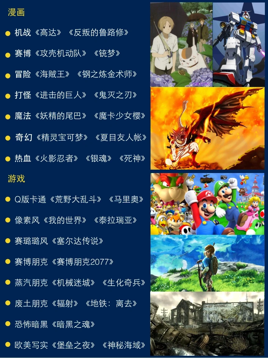 🎮而游戏则是传递风格的视觉通道。从平面到写实,可分为像素风、卡通风、日式平涂的赛璐璐风、欧美写实&魔幻&暗黑风、赛博&蒸汽&废土朋克风等9种风格。