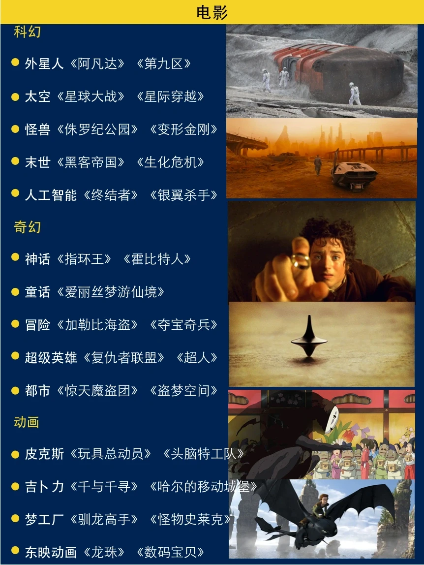 🎬电影是最直观的视觉通道,其中科幻、奇幻和动画三类最具想象,无论是《阿凡达》生活的潘多拉星球,还是《盗梦空间》所需的梦境建筑师,亦或是《千与千寻》神隐的温泉酒店,均为观众呈现出妙趣横生的脑洞世界。