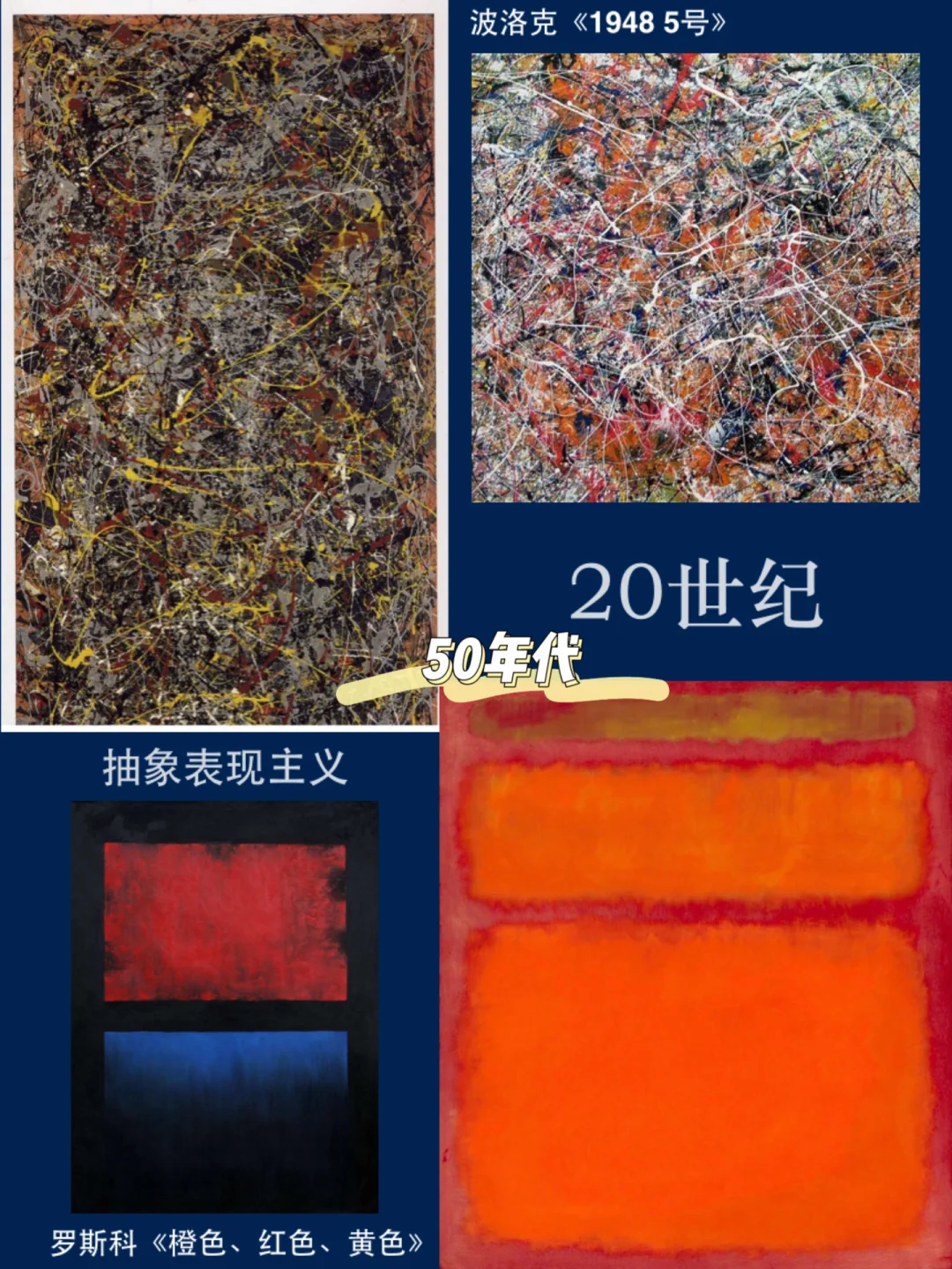🔹随后的50年代,美国本土艺术迎来了辉煌时刻—抽象表现主义确立了,并以此形成两种创作方向:以波洛克为代表的行动绘画和以罗斯科为代表的色域绘画。