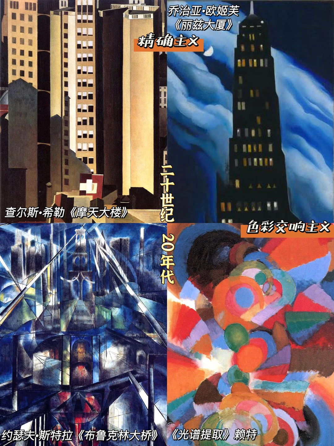 🔹20年代,美国第一个抽象绘画运动“精确主义”诞生了。在这里,画家专注于描绘现代化进程,带我们领略《摩天大楼》、《布鲁克林大桥》以及《纽约夜景》。