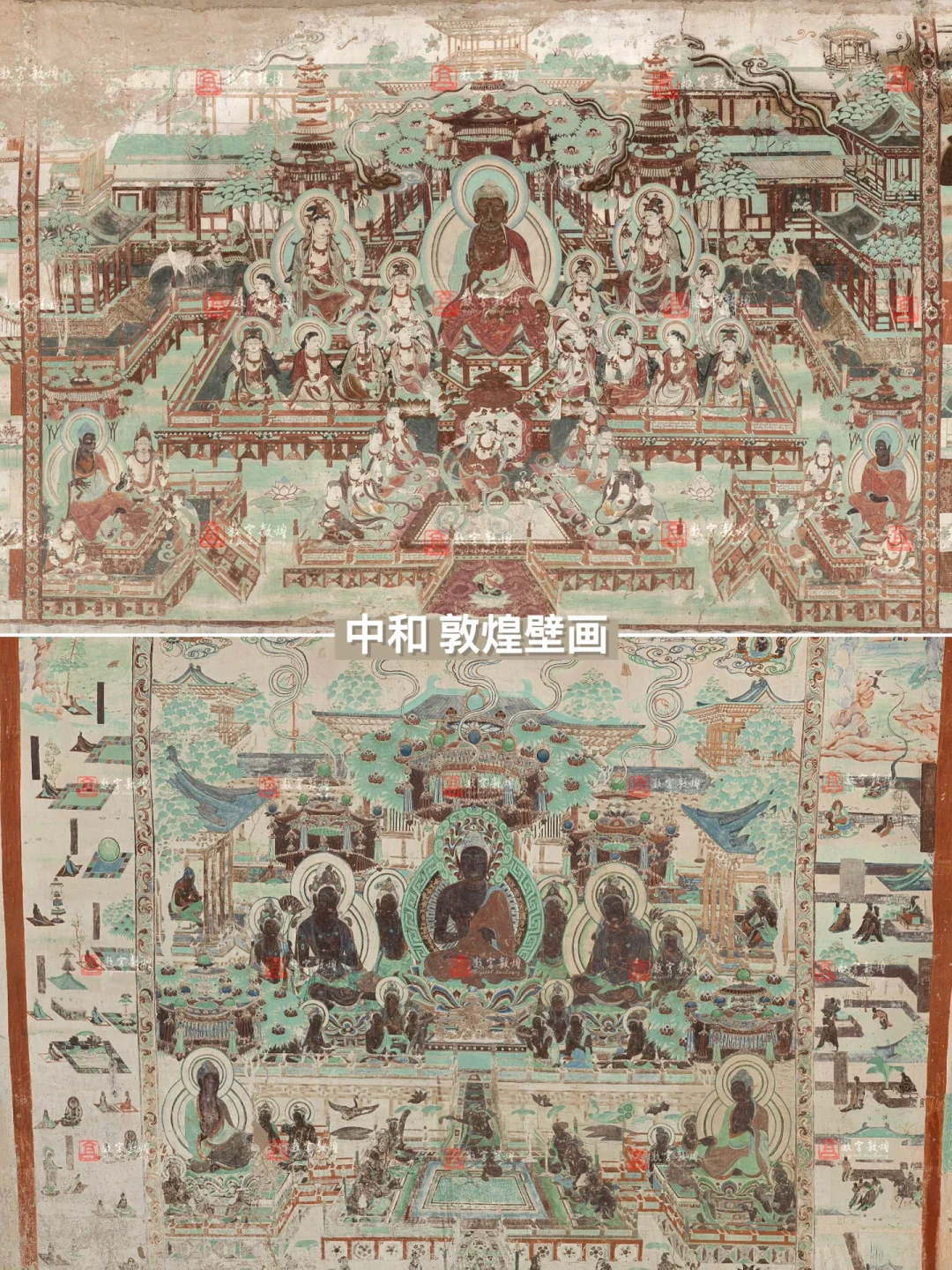 -绘画构图也讲究中和,最显著的是莫高窟里各种《经变图》壁画,中央一定是佛祖,两边分列着侍胁菩萨,及一众小菩萨,给人以和谐端庄、内心稳定之感。