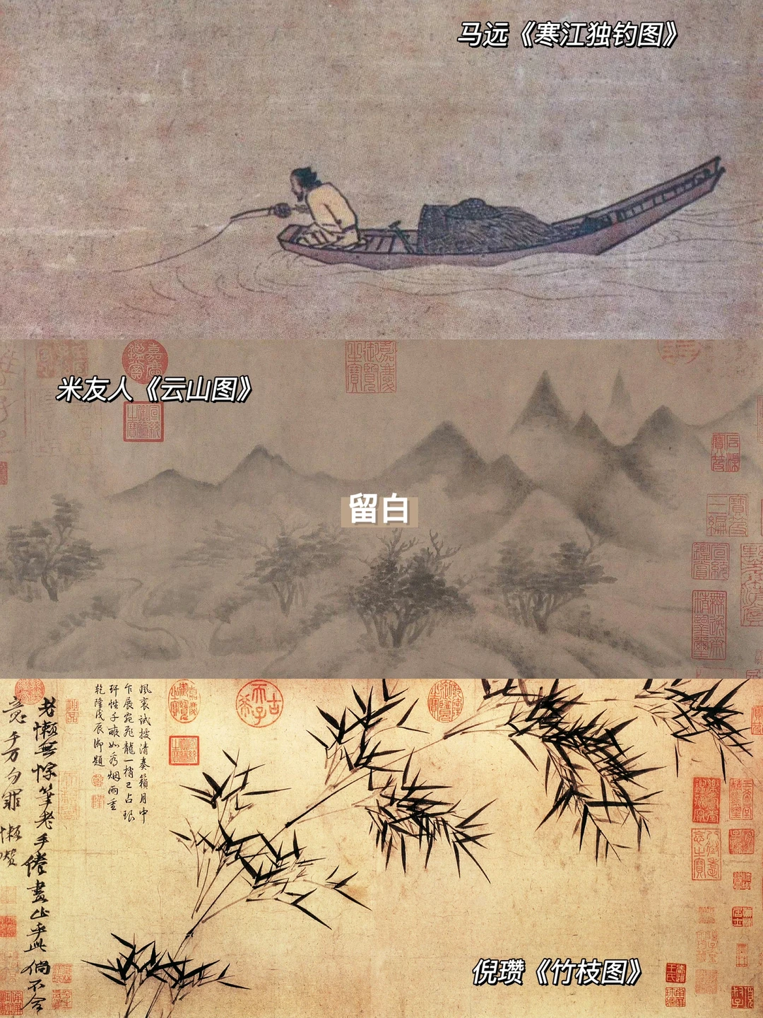 🔹留白,则是感受的最高境界。国画中,董源画景,山峦连绵,云雾暗晦;米友仁下笔,水墨横点,连点成片;马远构图,以小见大,清空朦胧;倪瓒写竹,寥寥数笔,逸气横生。