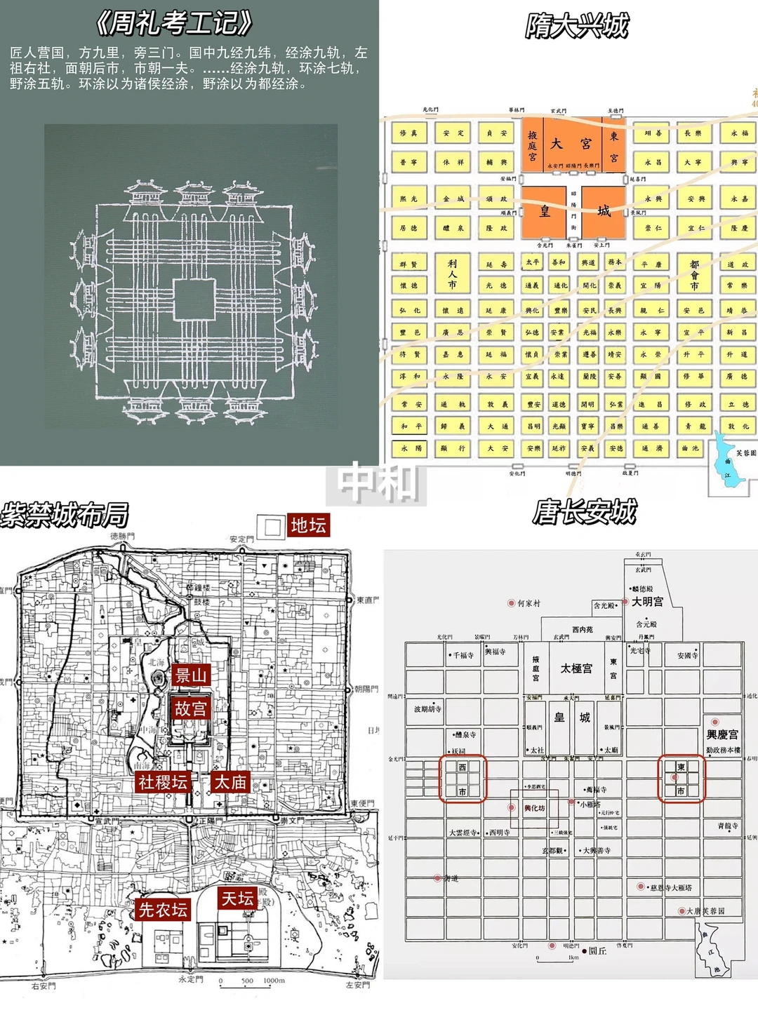 🔹内容含蓄符合中和之道,形式同样如此。《周礼考工记》曾说:都城要四四方方,每边开三个门,9条横纵干道将城市分为整齐的小方格,正中做宫城,形成前朝后市,左祖右社的布局。如今我们所见的故宫,便是严格按照以上设计,安稳地坐落在北京中轴线上。